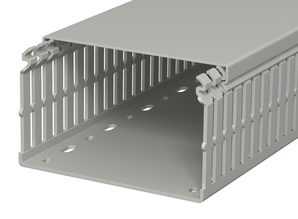 产品描述符合DIN EN 50085-2-3的布线线槽,包括盖和带孔基座,侧孔中的锥形防止电缆脱落。