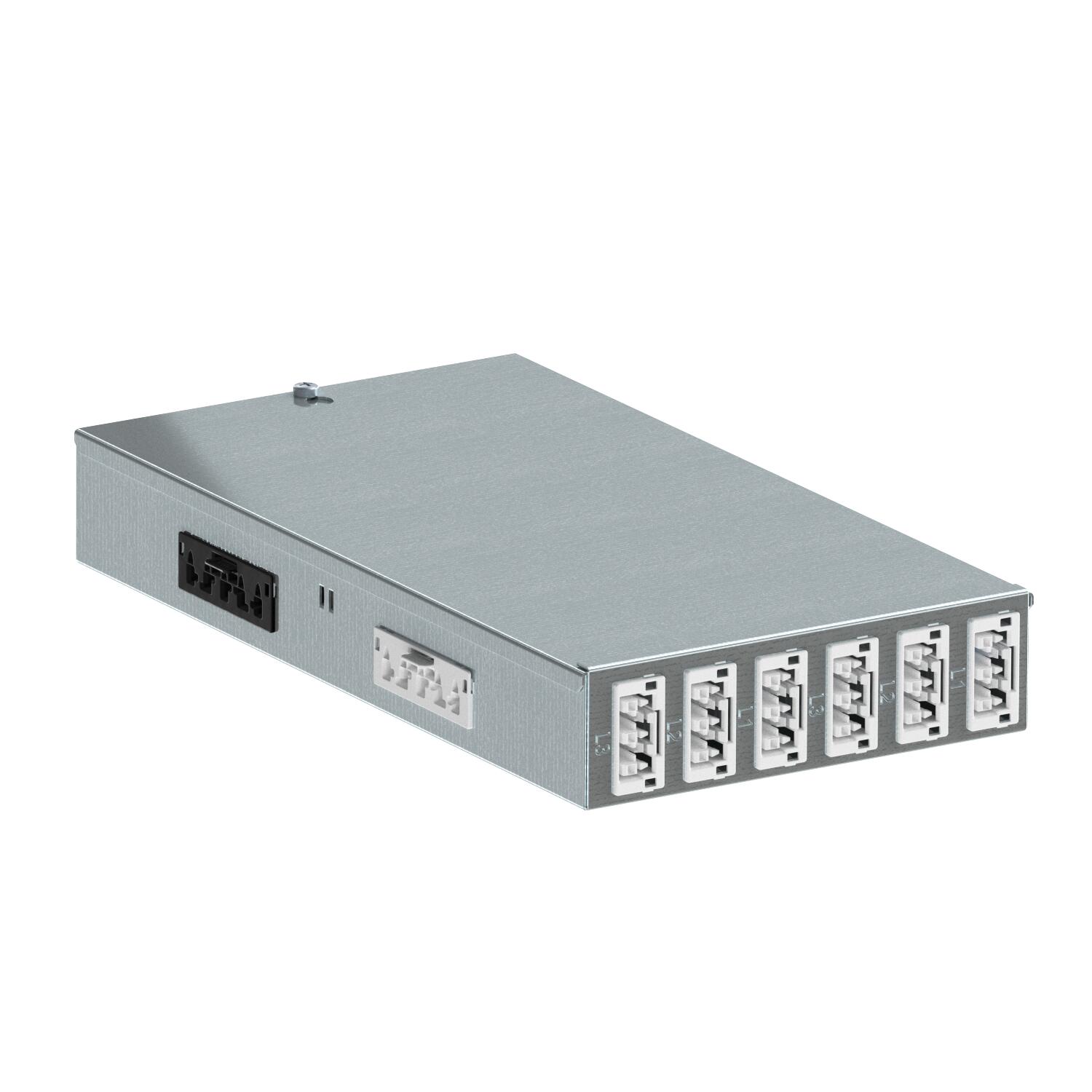 输出:12 个白色 (6 x) 和黑色 (3 x) 自锁式 3 pin插头连接器,25 A,类型 WINSTA® MIDI(插座部分:每三相电路 2 x L1、2 x L2、2 x L3)。