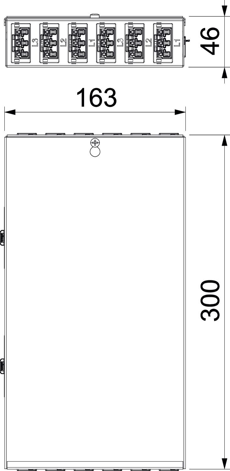 输出:12 个白色 (6 x) 和黑色 (3 x) 自锁 3 pin连接器,25 A,类型 WINSTA MIDI(插座部分:每三相电路 2 x L1、2 x L2、2 x L3)。