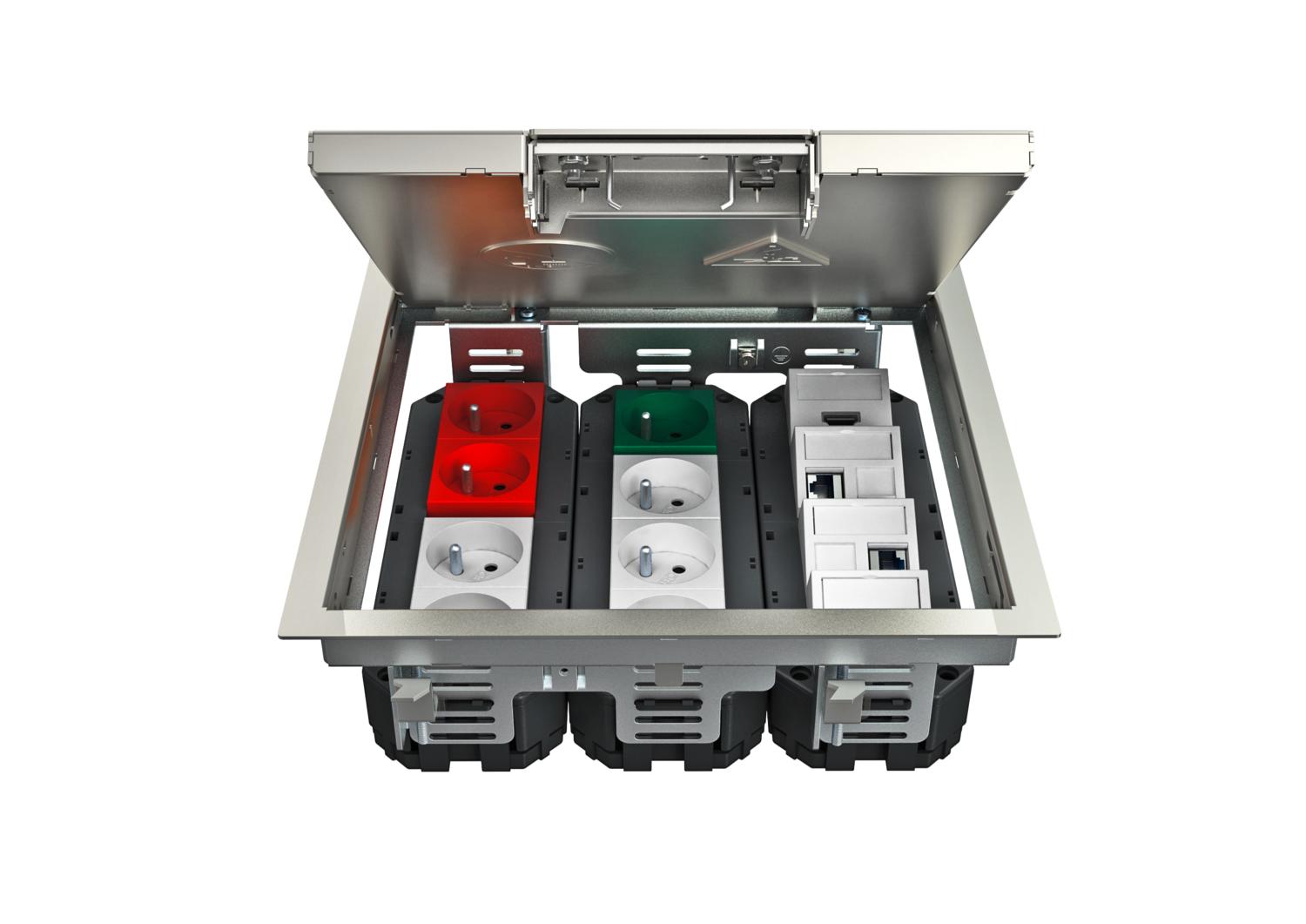 产品描述带有拉手的地插,最多可容纳3个UT4通用支架,安装12个单独的Modul 45设备,用于线槽系统和地板系统。