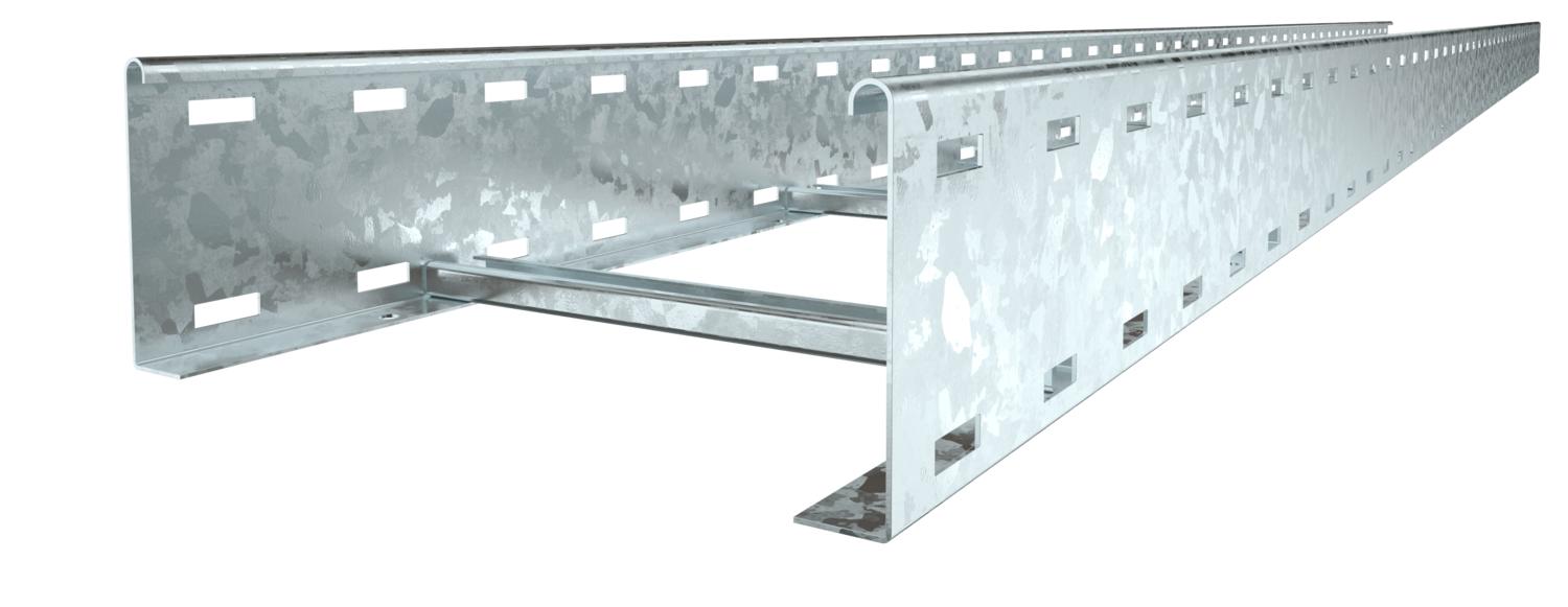 产品描述电缆梯架,带开孔侧围,侧高110 mm,带向上开口的铆接C形型材横杆。