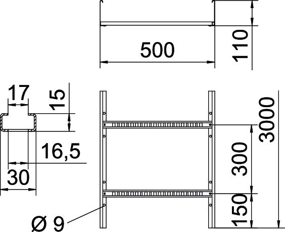 产品描述电缆梯架,带开孔侧围,侧高110 mm,带向上开口的铆接C形型材横杆。