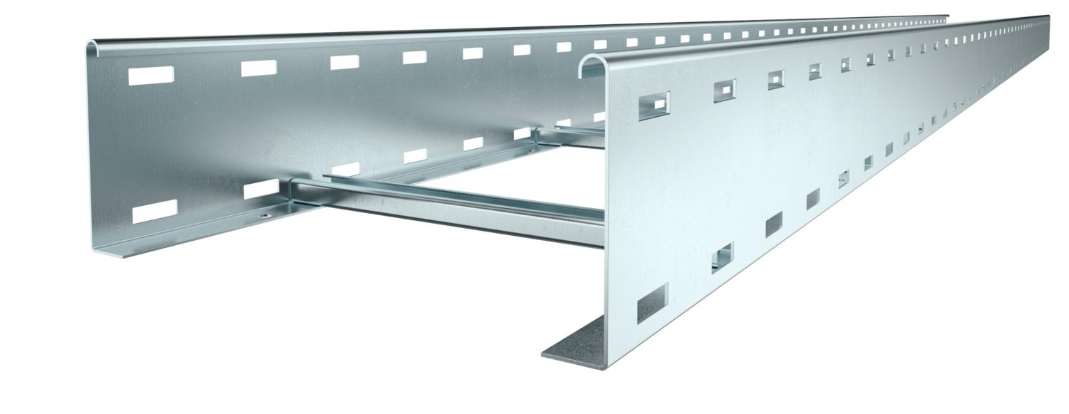产品描述电缆梯架,带开孔侧围,侧高110 mm,带向上开口的铆接C形型材横杆。