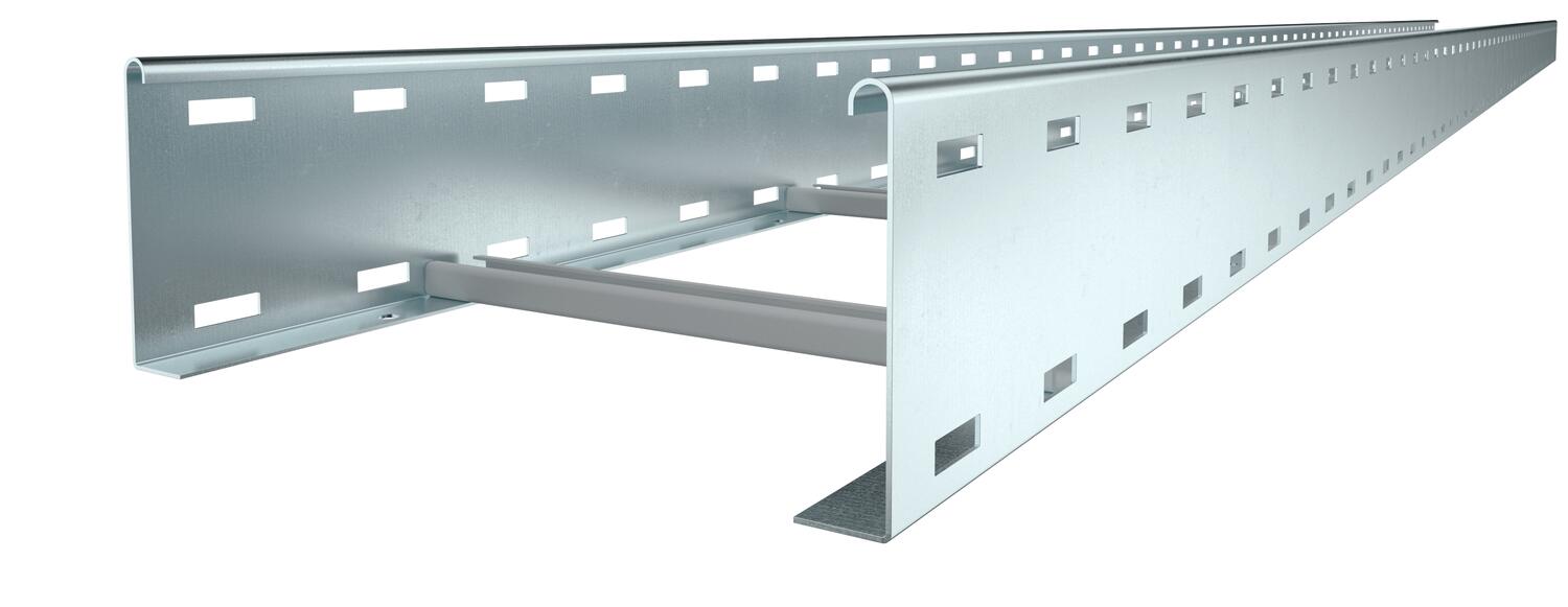 产品描述电缆梯架,带开孔侧围,侧高110 mm,带向上开口的铆接C形型材横杆。