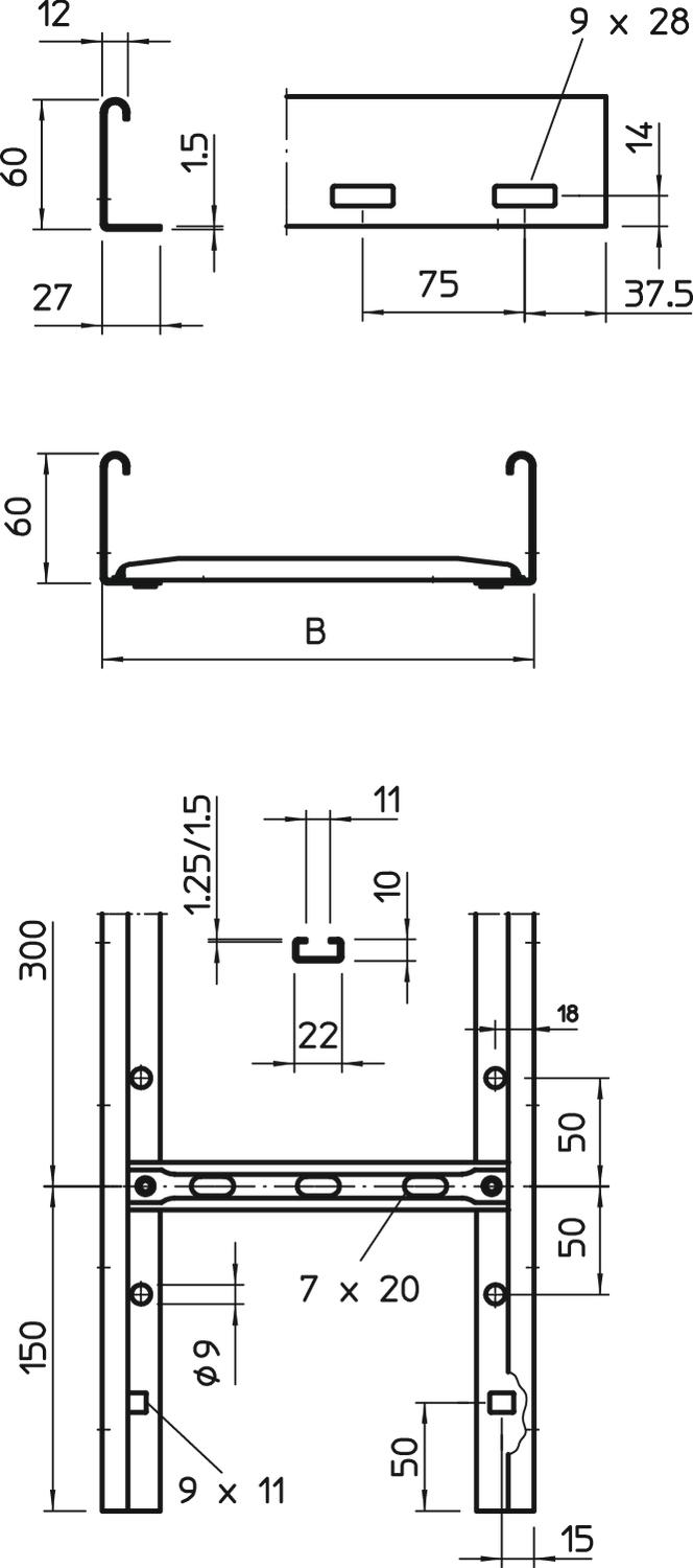 产品描述电缆梯架,带开孔的侧高 60 mm 的侧边,带铆接的开口向上的 C 型横档(NS 版本)。