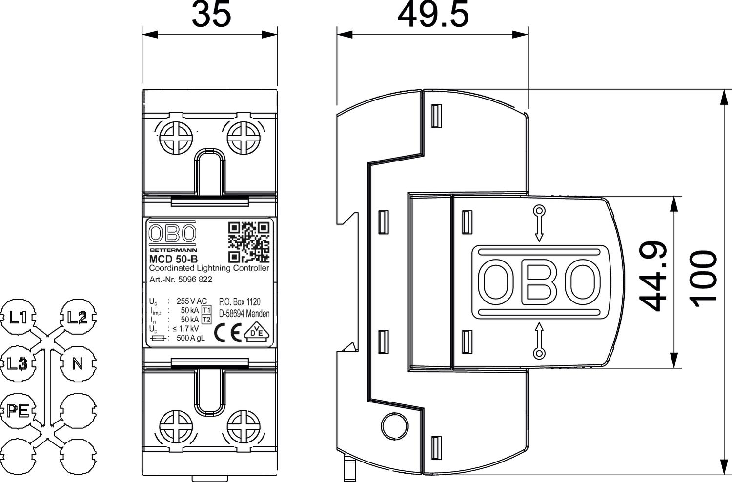 • 每极放电电流 50 kA (10/350),总计可达 150 kA (10/350)