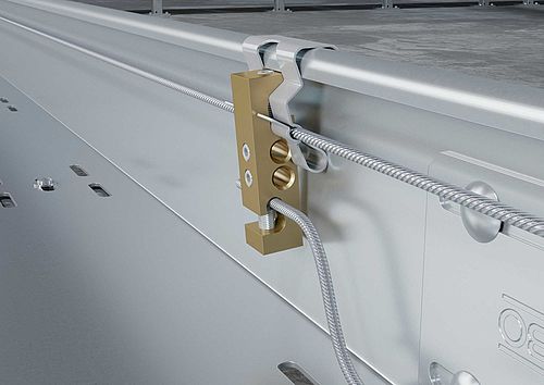 无需螺钉,通过夹紧弹簧KFL和接线端子AKL将可踩踏式电缆桥架系统快速集成到功能等电位连接中。导电性符合IEC 61537 – 由此确保电缆和导线的引导系统。 夹紧弹簧无需钻孔即可轻松夹在电缆桥架横梁上,并将导线束压入夹紧弹簧建立接触。连接端子可以轻松制造导线束的分支和出口。