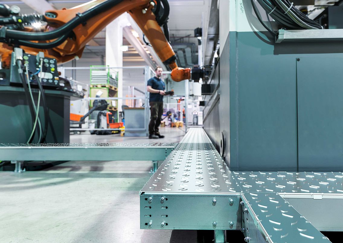 我们电缆线槽(也称电缆桥架)的防滑盖板的生产分为两个加工阶段,分别在冲压系统和成型系统进行。除了在每个生产步骤之前进行质量检查外,冲压系统中的摄像头还会检查电缆线槽的功能尺寸。我们的可踩踏式电缆线槽的新款波纹金属盖板提高了其防滑性。波纹金属盖板主要在冲压系统内生产。OBO Bettermann拥有该创新制造工艺的制造专利。
