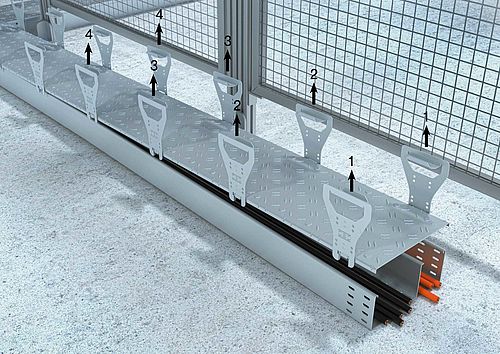 可踩踏式电缆桥架系统可以满足任何要求。安装时也是如此。电缆桥架的安装方式多种多样,可满足不同需求。您可以选择:将防滑电缆桥架安装在符合工作场所安全准则的托臂支架上,以避免滑倒和绊倒危险,并确保踩踏高度。用于托臂支架的特殊防护板降低了被绊倒的风险。Z型支架可简单而快速的支撑电缆桥架,并确保踩踏高度。而保护板作为侧板降低了绊倒的风险。在地面铺设电缆桥架最简单快捷的方式是直接在地面安装。较低的踩踏高度和波纹金属盖板的防滑性确保了在任何时候都可以安全作业。
