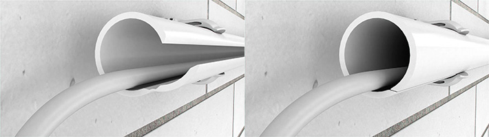 分为两半的快速管道成型件可以轻松夹在一起,还可以快速轻松地连接传统的电气安装管。也可以在没有任何问题的情况下重复打开成型件以进行后续安装:只需将螺丝刀插入开口槽中,转动,完成。如果快速管道安装管和成型件用 快速夹 固定,快速管道系统的防护等级为IP44。