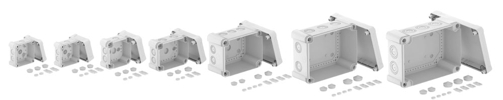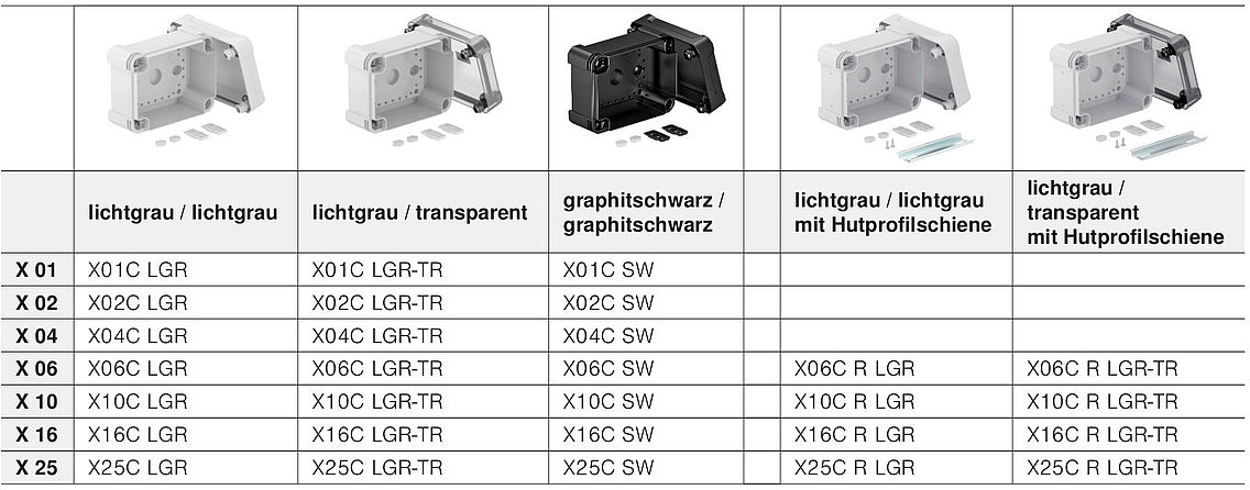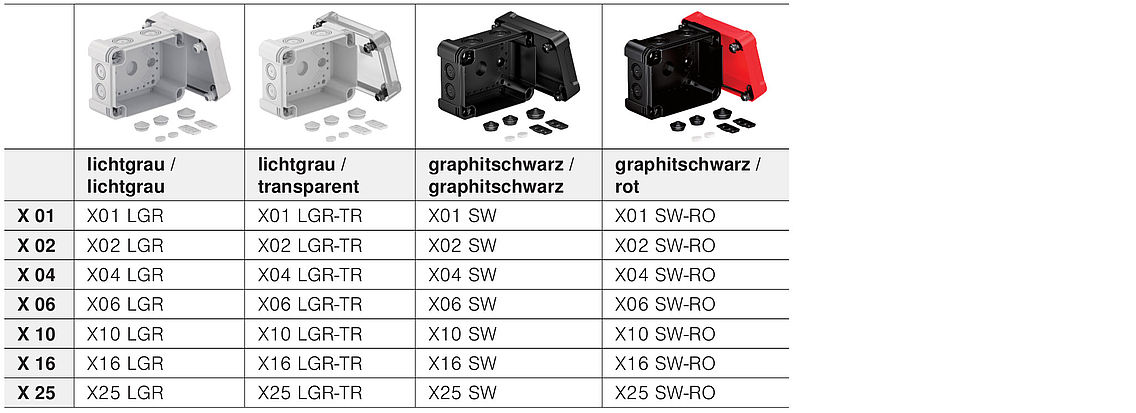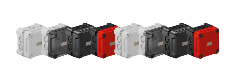 X 系列有各种颜色可供选择,让接线盒也能令人眼前一亮。盖子有浅灰色、透明色、黑色和红色。底座有浅灰色和黑色两种颜色。不同的色彩搭配让人很容易区分不同的电路。