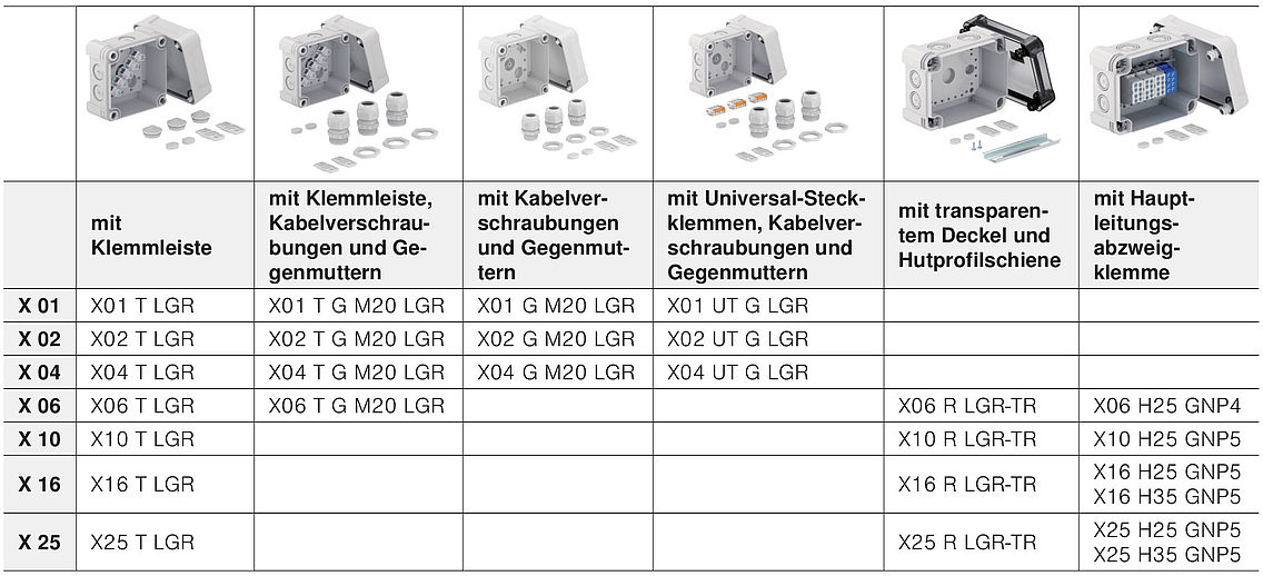 X系列接线盒和空壳具有特别高的抗冲击能力,机械碰撞防护等级达到IK09(适用于型号 X01 - X16)。这一点是通过使用基于高品质聚碳酸酯的特殊塑料实现的。所有 X 系列接线盒都根据 DIN EN 60670 第 1 部分和第 22 部分接受了测试。高达 IP67 的防护等级确保了必要的密封性。