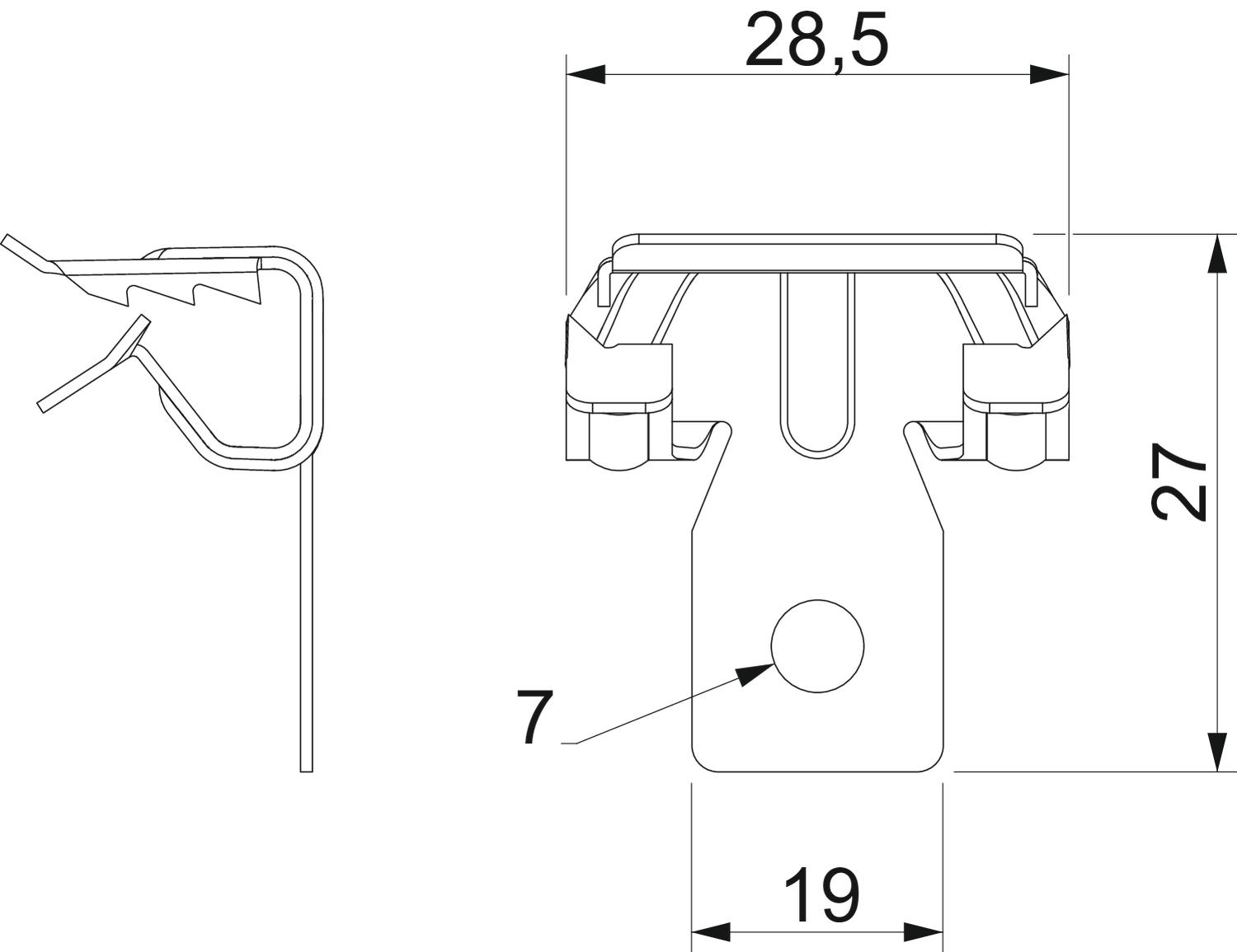 E尺寸 7 mm 可调铰链 否 固定孔 6,5 mm 固定方式 端子 尺寸 2-4mm 尺寸 B 28,5 mm 尺寸 L 27 mm 断裂荷载 0,45 kN 最大法兰厚度 F 4 mm 最小法兰厚度 F 2 mm 材料 钢 表面 锌板 连接类型/组件 孔 铰链式 否 - 所有型号