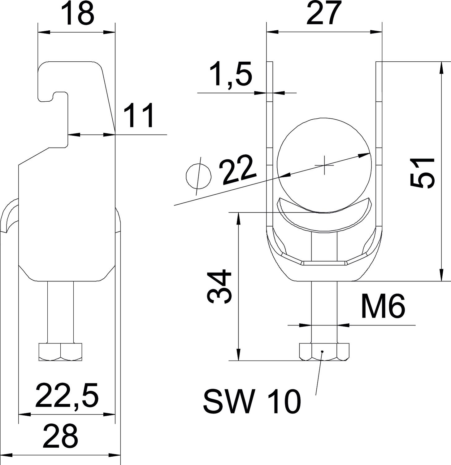 CO2 足迹 (GWP) 从摇篮到大门 0,1048 kg CO2e / 1 件 功能维护 是 外形长度 28 mm 安装方式 型材导轨 宽度 27 mm 尺寸 16-22mm 尺寸 A 22,5 mm 尺寸 B 27 mm 尺寸 C 18 mm 尺寸 L 34 mm 尺寸 t 1,5 mm 尺寸G (mm) M6 尺寸H 51 mm 带反向压板 否 带金属槽 是 无卤 是 最大 拧紧扭矩 3 Nm 最大夹紧范围 D 22 mm 最小夹紧范围 D 16 mm 材料 钢 材料添加 钢 板厚 1,5 mm 水槽材质 钢 电缆/管道数量 1 螺纹 M6 表面 热浸镀锌 表面添加 热镀锌 适用于采用最大槽宽(包括间隔)的导轨 22 mm 适用于采用最小槽宽(包括间隔)的导轨 18 mm 适用的最大管道直径 22 mm 适用的最小管道直径 16 mm 长度 22,5 mm 间隙 10 mm 高度 51 mm - 所有型号