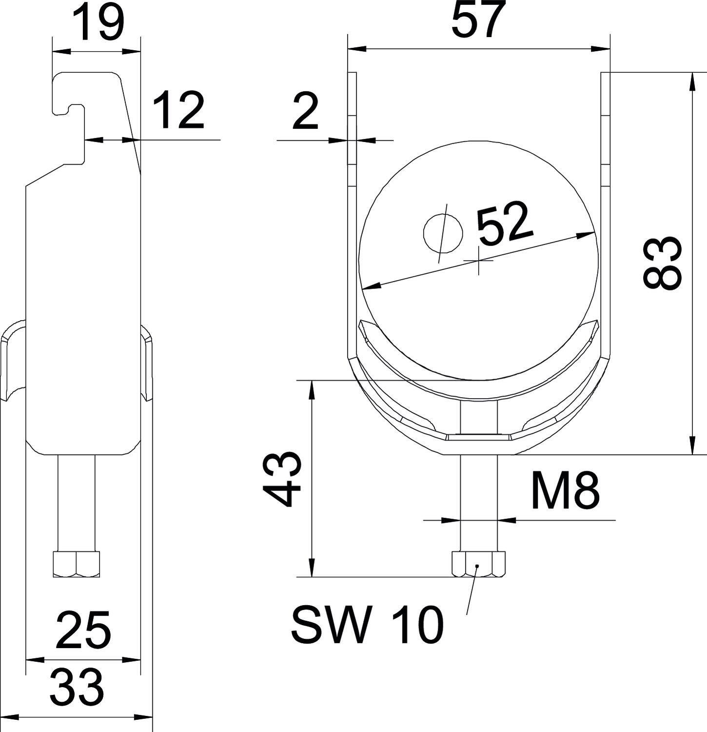 CO2 足迹 (GWP) 从摇篮到大门 0,2624 kg CO2e / 1 件 功能维护 是 外形长度 33 mm 安装方式 型材导轨 宽度 57 mm 尺寸 46-52mm 尺寸 A 25 mm 尺寸 B 57 mm 尺寸 C 33 mm 尺寸 L 43 mm 尺寸 t 2 mm 尺寸G (mm) M8 尺寸H 83 mm 带反向压板 否 带金属槽 是 无卤 是 最大 拧紧扭矩 5 Nm 最大夹紧范围 D 52 mm 最小夹紧范围 D 46 mm 材料 钢 材料添加 钢 板厚 2 mm 水槽材质 钢 电缆/管道数量 1 螺纹 M8 表面 热浸镀锌 表面添加 热镀锌 适用于采用最大槽宽(包括间隔)的导轨 22 mm 适用于采用最小槽宽(包括间隔)的导轨 18 mm 适用的最大管道直径 52 mm 适用的最小管道直径 46 mm 长度 25 mm 间隙 10 mm 高度 83 mm - 所有型号
