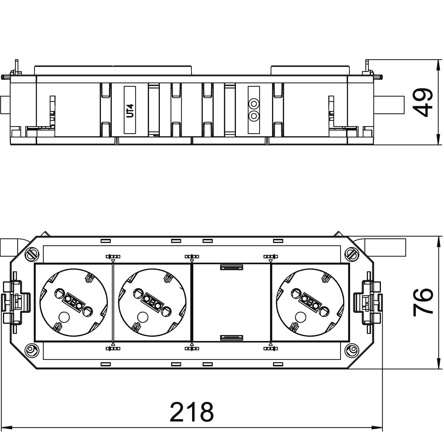 即插即用的通用支架 UTC4 ,有 2 个预装的橙色 33° 保护触点插座和一个预装的薄荷绿色 33° 保护触点插座和一个空白盖,用于随后安装 Modul45 或Modul 45connect 系列,250 V ~ 16 A。