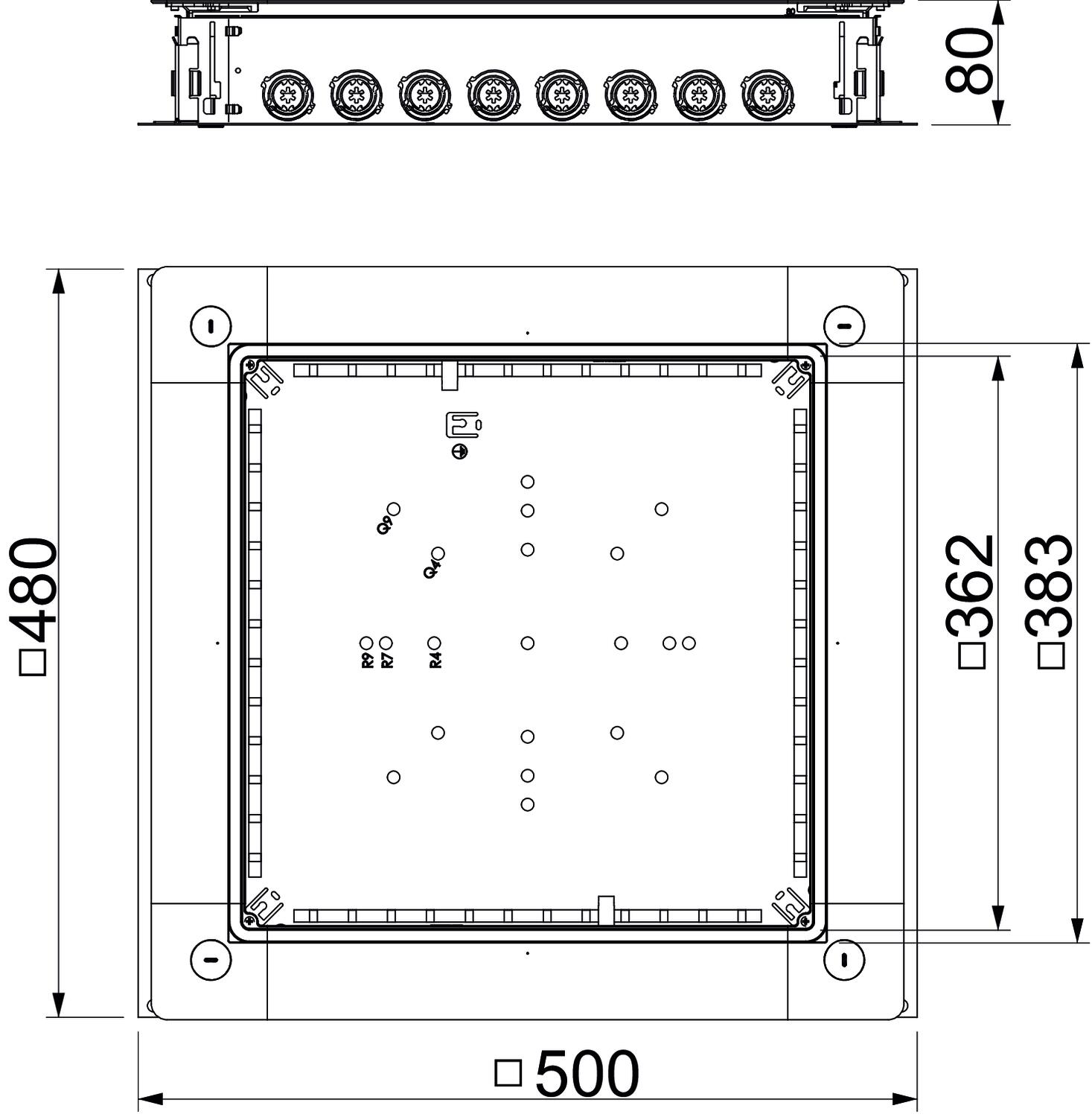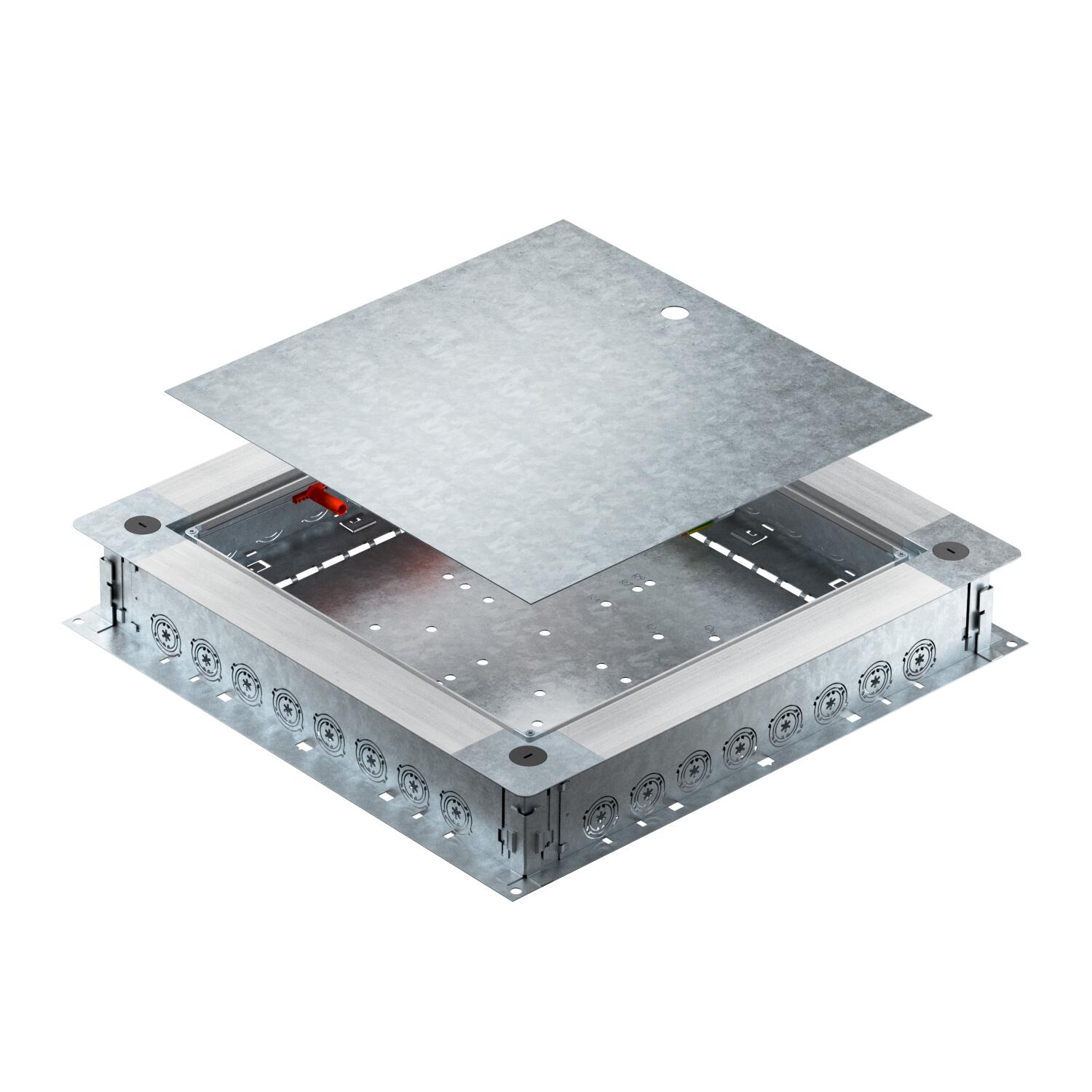 Junction and branch box UZD350-4 R with side walls made of sheet steel. For mounting of installation units in the mounting lid (to be ordered separately). Can be infinitely adjusted to a nominal screed height of 80–160 mm using the quick height-adjustment unit. The screed can be worked up to be flush with the screed edge. With an acoustic decoupling option after screed laying, and with system accessories, it can be used for heavy-duty applications. Insertion of cables through the pipe entries. Pipe entry per side suitable for 8 installation pipes each of the diameters M20, M25 and M32