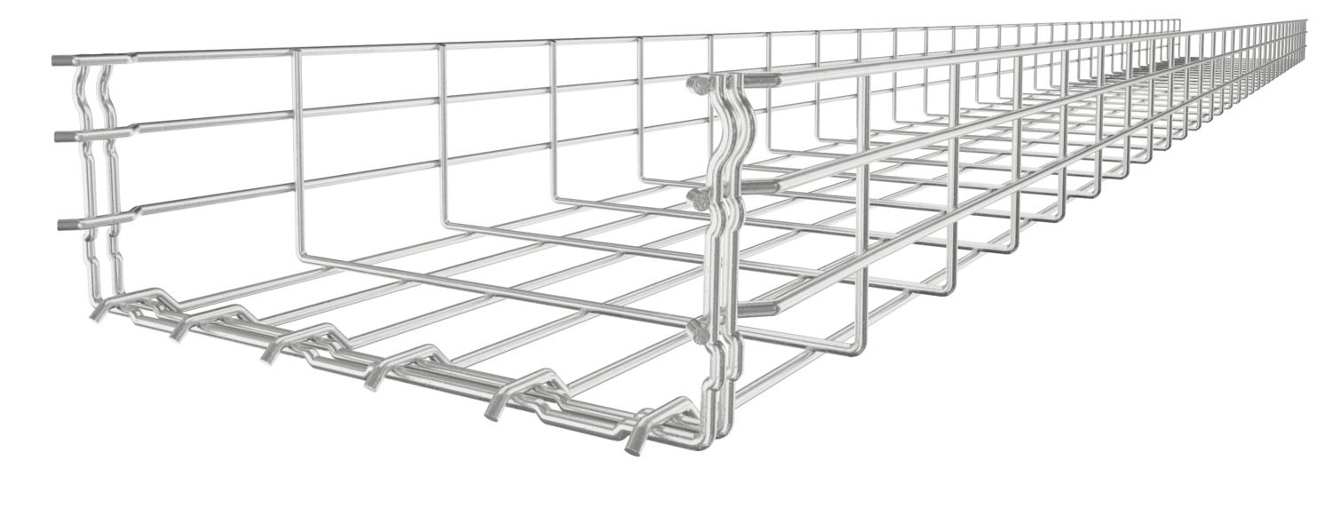 网格式桥架不需要任何额外的连接件,只需相互卡接在一起即可。 网孔尺寸为50 x 100 mm。