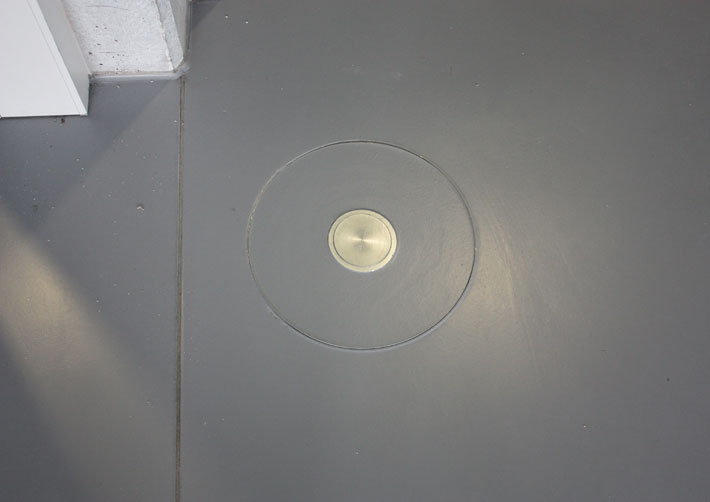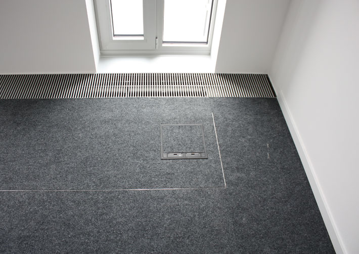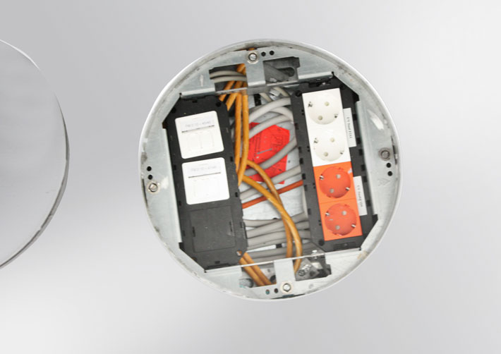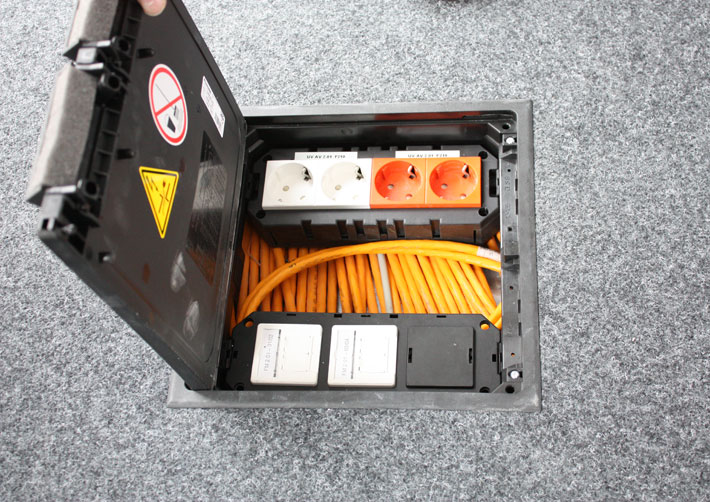 The presentation rooms on the ground floor are supplied with power and data connections via the screed-covered EÜK system, in combination with round VA cassettes. The use of cassettes with lowerable tube body as a cable outlet means that the floor areas can be wet-cleaned. The floor covering recesses of the VA cassettes were cast in epoxy resin to match the floor area and thus blend seamlessly into the appearance of the floor.