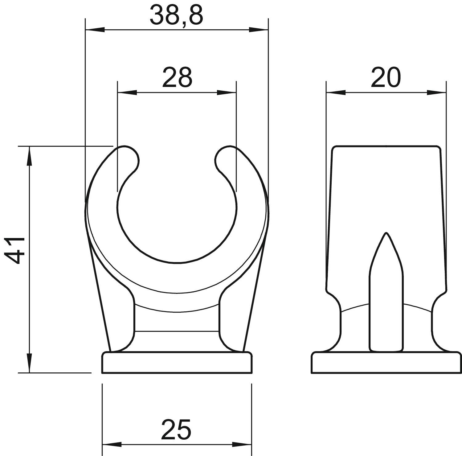 Clamping range D, max. 28 mm Clamping range D, min. 25 mm CO2 Footprint (GWP) Cradle-to-Gate 0,041 kg CO2e / 1 Piece Colour Light grey; RAL 7035 Dimension 25-28mm Dimension A 38,8 mm Dimension B 20 mm Dimension C 25 mm Dimension H 41 mm Fastening type Threaded connection Halogen-free yes Material Polypropylene Nominal diameter 25 mm Number of cables/pipes 1 Plastic-covered no Size 25-28 Suitable in fire protection area no UV-resistant no Version for Single-lobe - All types