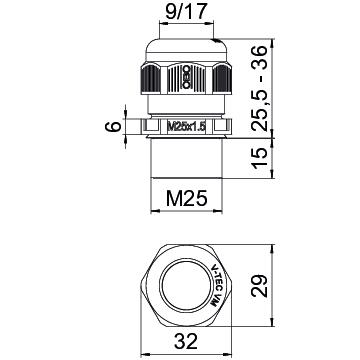 Bend protection no CO2 Footprint (GWP) Cradle-to-Gate 0,0688 kg CO2e / 1 Piece Colour Light grey; RAL 7035 Dimension M25 Dimension E 32 mm Dimension L max. 36 mm Dimension L min. 25,5 mm Dimension L1 15 mm Dimension L2 6 mm explosion-proof no Fibre-glass reinforced no Flame-resistant acc. to VDE 0471/DIN 695 Part 2-1, test temperature 650°C Flat cable gland no For Ex zone Without For Ex zone dust Without For Ex zone gas Without Halogen-free yes Hexagonal corner dimension 32 mm Impact-resistant no Material Polyamide Nominal thread size 25 Permitted temperature range, max. 65 °C Permitted temperature range, min. -20 °C Protection rating IP68 Sealing area D, max. 17 mm Sealing area D, min. 9 mm Sealing insert, multiple no Splittable gland no Strain relief option yes Thread M25 x 1,5 Thread increase 1,5 mm Thread length 15 mm Thread type Metric Type of seal Sealing ring Unstable torque 5 Nm Version for Straight WAF 29 With locknut no - All types