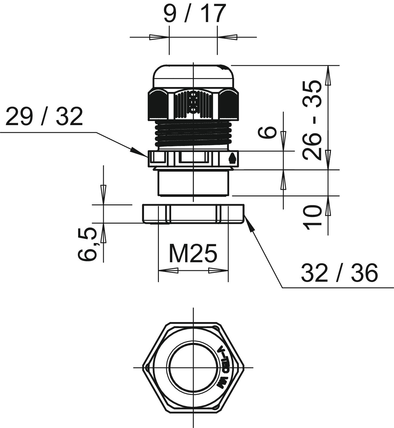 Bend protection no CO2 Footprint (GWP) Cradle-to-Gate 0,0783 kg CO2e / 1 Piece Colour Light grey; RAL 7035 Dimension M25 Dimension E1 (mm) 32 mm Dimension E2 36 mm Dimension L max. 35 mm Dimension L min. 26 mm Dimension L1 10 mm Dimension L2 6 mm Dimension L3 6,5 mm explosion-proof no Fibre-glass reinforced no Flame-resistant acc. to VDE 0471/DIN 695 Part 2-1, test temperature 650°C Flat cable gland no For Ex zone Without For Ex zone dust Without For Ex zone gas Without Halogen-free yes Impact-resistant no Material Polyamide Nominal thread size 25 Permitted temperature range, max. 65 °C Permitted temperature range, min. -20 °C Protection rating IP68 Sealing area D, max. 17 mm Sealing area D, min. 9 mm Sealing insert, multiple no Splittable gland no Strain relief option yes Thread M25 x 1,5 Thread increase 1,5 mm Thread length 10 mm Thread type Metric Type of seal Sealing ring Unstable torque 5 Nm Version for Straight WAF 1 29 mm WAF 2 32 mm With locknut no - All types