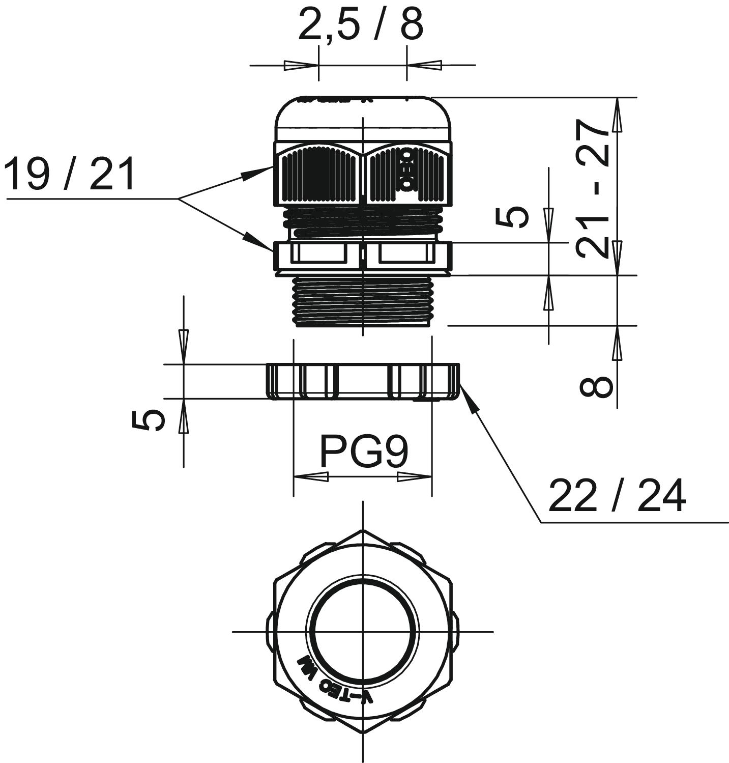 Bend protection no CO2 Footprint (GWP) Cradle-to-Gate 0,0421 kg CO2e / 1 Piece Colour Light grey; RAL 7035 Dimension PG9 Dimension E1 (mm) 24 mm Dimension E2 21 mm Dimension L max. 27 mm Dimension L min. 21 mm Dimension L1 8 mm Dimension L2 5 mm Dimension L3 5 mm explosion-proof no Fibre-glass reinforced no Flat cable gland no For Ex zone Without For Ex zone dust Without For Ex zone gas Without Halogen-free yes Hexagonal corner dimension 21 mm Impact-resistant no Material Polyamide Nominal thread size 9 Permitted temperature range, max. 65 °C Permitted temperature range, min. -20 °C Protection rating IP68 Sealing area D, max. 8 mm Sealing area D, min. 2,5 mm Sealing insert, multiple no Splittable gland no Strain relief option yes Thread Pg 9 Thread increase 1,5 mm Thread length 8 mm Thread type PG Type of seal Sealing ring Version for Straight WAF 1 19 mm WAF 2 22 mm With locknut yes - All types