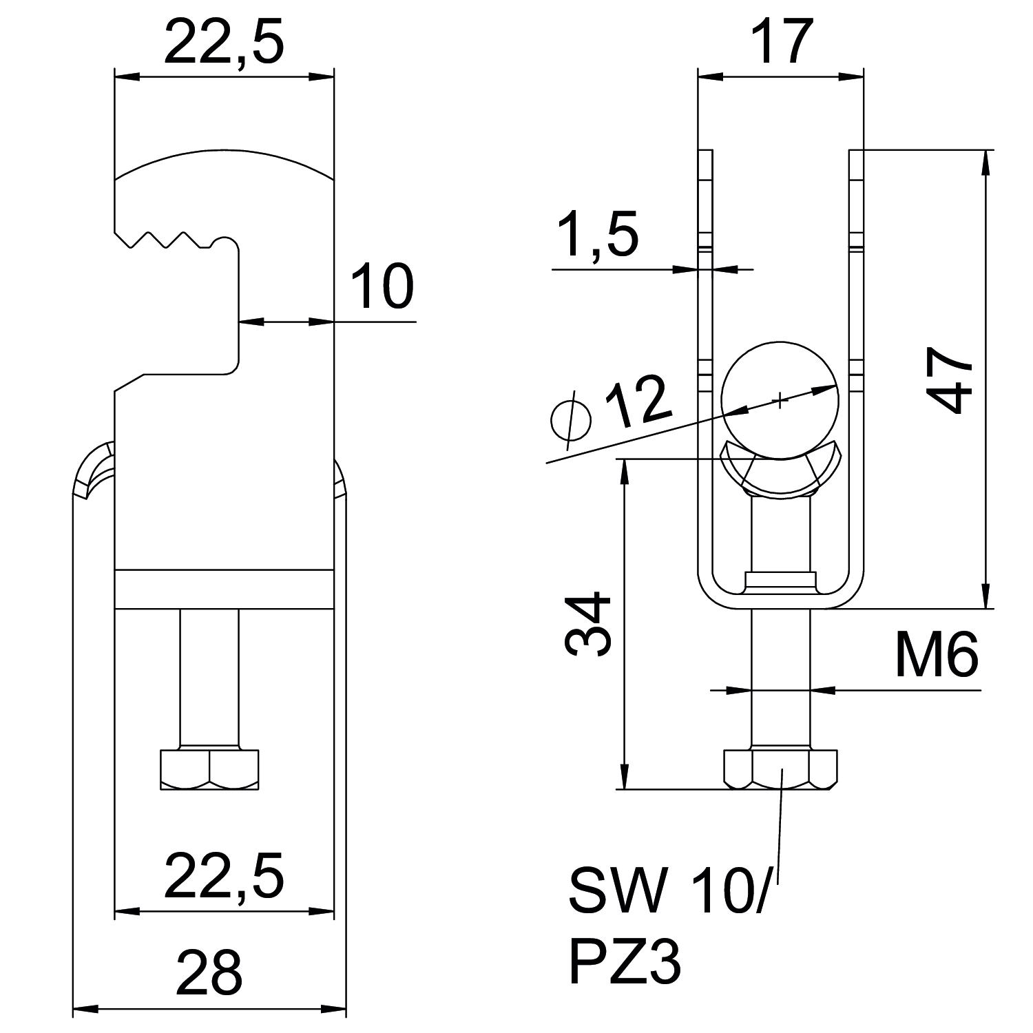 Clamping range D, max. 12 mm Clamping range D, min. 8 mm CO2 Footprint (GWP) Cradle-to-Gate 0,2642 kg CO2e / 1 Piece Dimension 08-12mm Dimension A 22,5 mm Dimension B 17 mm Dimension C 28 mm Dimension G (mm) M6 Dimension H 47 mm Dimension L 34 mm Dimension t 1,5 mm For pipe diameter, max. 12 mm For pipe diameter, min. 8 mm Halogen-free yes Height 47 mm Length 22,5 mm Length of external dimensions 28 mm Material Stainless steel 1.4301 Material addition Rustproof steel Material of trough Rustproof steel Material quality of trough Stainless steel 304 (1.4301) Max. Tightening torque 3 Nm Mounting type Flat profile Number of cables/pipes 1 Plate thickness 1,5 mm Slot width 10 mm Surface Bright, treated Surface addition Untreated Thread M6 Width 17 mm With counter-trough no With metal trough yes - All types