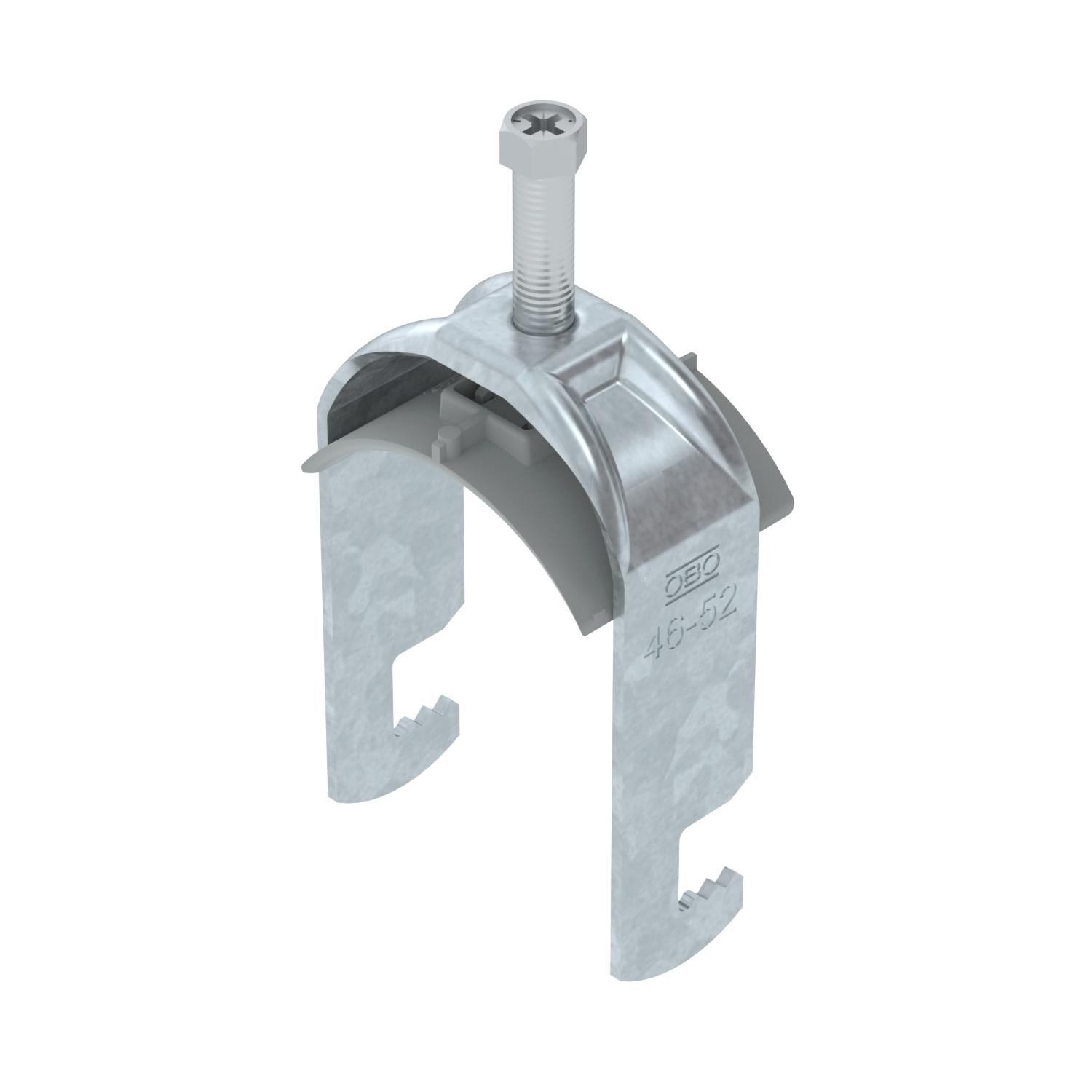 Clamping range D, max. 52 mm Clamping range D, min. 46 mm CO2 Footprint (GWP) Cradle-to-Gate 0,2334 kg CO2e / 1 Piece Dimension 46-52mm Dimension A 25 mm Dimension B 57 mm Dimension C 40 mm Dimension G (mm) M8 Dimension H 90 mm Dimension L 45 mm Dimension t 2 mm For pipe diameter, max. 52 mm For pipe diameter, min. 46 mm Halogen-free yes Height 90 mm Length 25 mm Length of external dimensions 40 mm Material Steel Material addition Steel Material of trough Plastic Material quality of trough Polypropylene Max. Tightening torque 5 Nm Mounting type Flat profile Number of cables/pipes 1 Plate thickness 2 mm Slot width 10 mm Surface Hot-dip galvanised Surface addition hot galvanised Thread M8 Width 57 mm With counter-trough no With plastic trough yes - All types