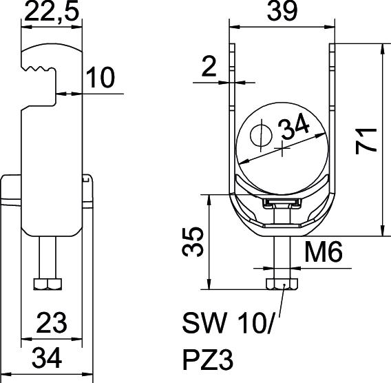 Product descriptionClamp clip with F-foot, plastic pressure sleeve made of polypropylene. For vertical and horizontal mounting of 1 single cable on flat bars. With 1-start screw thread on pressure sleeve, universal hexagonal screw head WAF10, with slot and cross recess. Suitable for assembly indoors and outdoors. We recommend the use of a counter-sleeve.