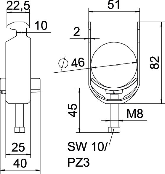 Clamping range D, max. 46 mm Clamping range D, min. 40 mm CO2 Footprint (GWP) Cradle-to-Gate 0,6182 kg CO2e / 1 Piece Dimension 40-46mm Dimension A 25 mm Dimension B 51 mm Dimension C 40 mm Dimension G (mm) M8 Dimension H 82 mm Dimension L 45 mm Dimension t 2 mm For pipe diameter, max. 46 mm For pipe diameter, min. 40 mm for rail with slot width (with interval), max. 17 mm for rail with slot width (with interval), min. 16 mm Halogen-free yes Height 82 mm Length 25 mm Length of external dimensions 40 mm Material Stainless steel 1.4301 Material addition Rustproof steel Material of trough Plastic Material quality of trough Polypropylene Max. Tightening torque 5 Nm Mounting type Profile rail Number of cables/pipes 1 Plate thickness 2 mm Slot width 10 mm Surface Bright, treated Surface addition Untreated Thread M8 Width 51 mm With counter-trough no With plastic trough yes - All types