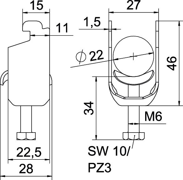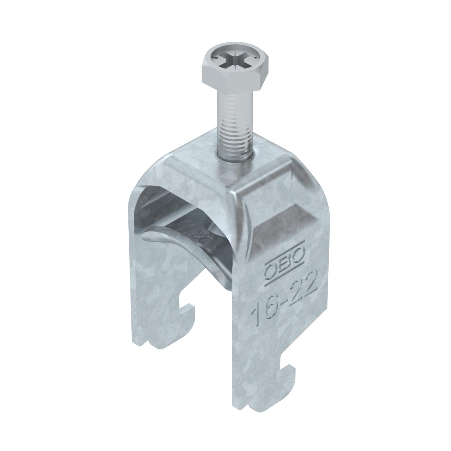 Clamping range D, max. 22 mm Clamping range D, min. 16 mm CO2 Footprint (GWP) Cradle-to-Gate 0,1008 kg CO2e / 1 Piece Dimension 16-22mm Dimension A 22,5 mm Dimension B 27 mm Dimension C 28 mm Dimension G (mm) M6 Dimension H 46 mm Dimension L 34 mm Dimension t 1,5 mm For pipe diameter, max. 22 mm For pipe diameter, min. 16 mm for rail with slot width (with interval), max. 12 mm for rail with slot width (with interval), min. 11 mm Halogen-free yes Height 46 mm Length 22,5 mm Length of external dimensions 28 mm Material Steel Material addition Steel Material of trough Steel Max. Tightening torque 3 Nm Mounting type Profile rail Number of cables/pipes 1 Plate thickness 1,5 mm Slot width 10 mm Surface Hot-dip galvanised Surface addition hot galvanised Thread M6 Width 27 mm With counter-trough no With metal trough yes - All types