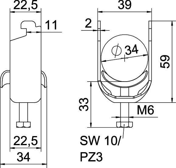 Clamping range D, max. 34 mm Clamping range D, min. 28 mm CO2 Footprint (GWP) Cradle-to-Gate 0,1588 kg CO2e / 1 Piece Dimension 28-34mm Dimension A 22,5 mm Dimension B 39 mm Dimension C 34 mm Dimension G (mm) M6 Dimension H 59 mm Dimension L 34 mm Dimension t 2 mm For pipe diameter, max. 34 mm For pipe diameter, min. 28 mm for rail with slot width (with interval), max. 12 mm for rail with slot width (with interval), min. 11 mm Halogen-free yes Height 59 mm Length 22,5 mm Length of external dimensions 34 mm Material Steel Material addition Steel Material of trough Steel Max. Tightening torque 3 Nm Mounting type Profile rail Number of cables/pipes 1 Plate thickness 2 mm Slot width 10 mm Surface Hot-dip galvanised Surface addition hot galvanised Thread M6 Width 39 mm With counter-trough no With metal trough yes - All types