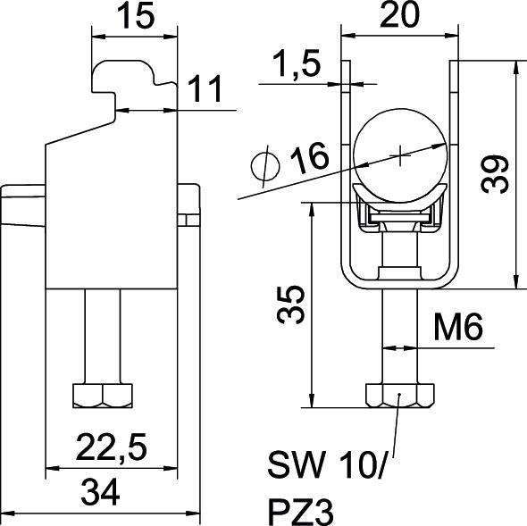 Clamping range D, max. 16 mm Clamping range D, min. 12 mm CO2 Footprint (GWP) Cradle-to-Gate 0,0725 kg CO2e / 1 Piece Dimension 12-16mm Dimension A 22,5 mm Dimension B 20 mm Dimension C 34 mm Dimension G (mm) M6 Dimension H 39 mm Dimension L 35 mm Dimension t 1,5 mm For pipe diameter, max. 16 mm For pipe diameter, min. 12 mm for rail with slot width (with interval), max. 12 mm for rail with slot width (with interval), min. 11 mm Halogen-free yes Height 39 mm Length 22,5 mm Length of external dimensions 34 mm Material Steel Material addition Steel Material of trough Plastic Material quality of trough Polypropylene Max. Tightening torque 3 Nm Mounting type Profile rail Number of cables/pipes 1 Plate thickness 1,5 mm Slot width 10 mm Surface Hot-dip galvanised Surface addition hot galvanised Thread M6 Width 20 mm With counter-trough no With plastic trough yes - All types