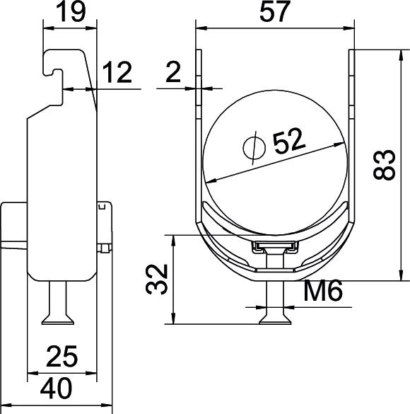 Clamping range D, max. 52 mm Clamping range D, min. 46 mm CO2 Footprint (GWP) Cradle-to-Gate 0,2219 kg CO2e / 1 Piece Dimension 46-52mm Dimension A 25 mm Dimension B 57 mm Dimension C 40 mm Dimension G (mm) M6 Dimension H 83 mm Dimension L 45 mm Dimension t 2 mm For pipe diameter, max. 52 mm For pipe diameter, min. 46 mm for rail with slot width (with interval), max. 22 mm for rail with slot width (with interval), min. 18 mm Halogen-free yes Height 83 mm Length 25 mm Length of external dimensions 40 mm Material Steel Material addition Steel Material of trough Plastic Material quality of trough Polypropylene Max. Tightening torque 5 Nm Mounting type Profile rail Number of cables/pipes 1 Plate thickness 2 mm Slot width 10 mm Surface Hot-dip galvanised Surface addition hot galvanised Thread M6 Width 57 mm With counter-trough no With plastic trough yes - All types