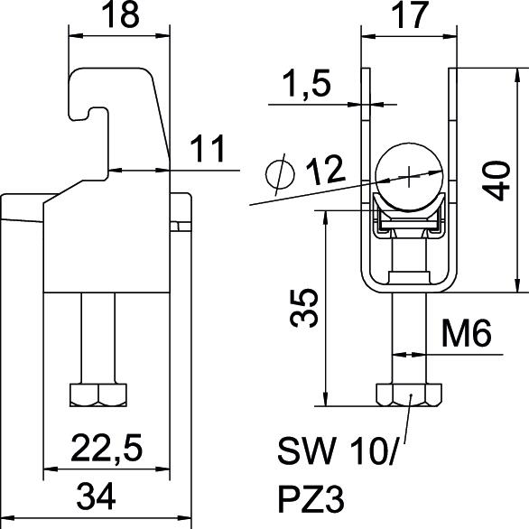 Clamping range D, max. 12 mm Clamping range D, min. 8 mm CO2 Footprint (GWP) Cradle-to-Gate 0,0765 kg CO2e / 1 Piece Dimension 08-12mm Dimension A 22,5 mm Dimension B 17 mm Dimension C 34 mm Dimension G (mm) M6 Dimension H 40 mm Dimension L 35 mm Dimension t 1,5 mm For pipe diameter, max. 12 mm For pipe diameter, min. 8 mm for rail with slot width (with interval), max. 22 mm for rail with slot width (with interval), min. 18 mm Halogen-free yes Height 40 mm Length 22,5 mm Length of external dimensions 34 mm Material Steel Material addition Steel Material of trough Plastic Material quality of trough Polypropylene Max. Tightening torque 3 Nm Mounting type Profile rail Number of cables/pipes 1 Plate thickness 1,5 mm Slot width 10 mm Surface Hot-dip galvanised Surface addition hot galvanised Thread M6 Width 17 mm With counter-trough no With plastic trough yes - All types