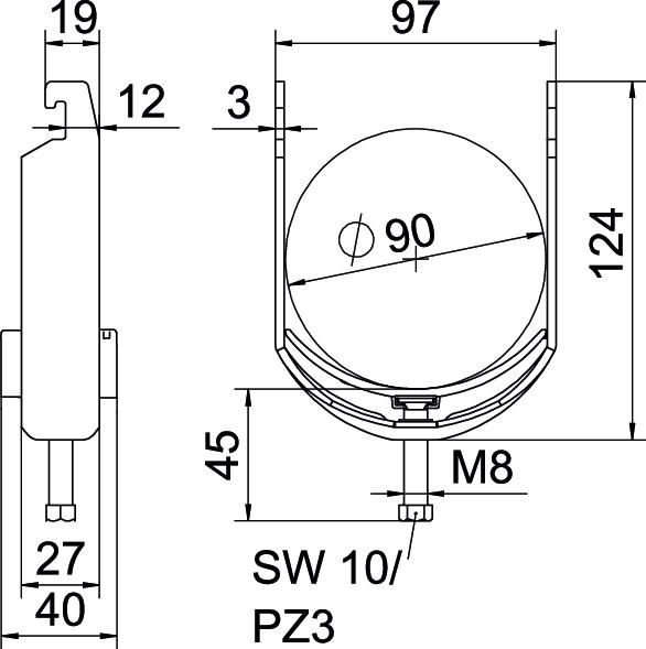 Clamping range D, max. 90 mm Clamping range D, min. 82 mm CO2 Footprint (GWP) Cradle-to-Gate 0,6095 kg CO2e / 1 Piece Dimension 82-90mm Dimension A 27 mm Dimension B 97 mm Dimension C 40 mm Dimension G (mm) M8 Dimension H 124 mm Dimension L 45 mm Dimension t 3 mm For pipe diameter, max. 90 mm For pipe diameter, min. 82 mm for rail with slot width (with interval), max. 22 mm for rail with slot width (with interval), min. 18 mm Halogen-free yes Height 124 mm Length 27 mm Length of external dimensions 40 mm Material Steel Material addition Steel Material of trough Plastic Material quality of trough Polypropylene Max. Tightening torque 5 Nm Mounting type Profile rail Number of cables/pipes 1 Plate thickness 3 mm Slot width 10 mm Surface Hot-dip galvanised Surface addition hot galvanised Thread M8 Width 97 mm With counter-trough no With plastic trough yes - All types