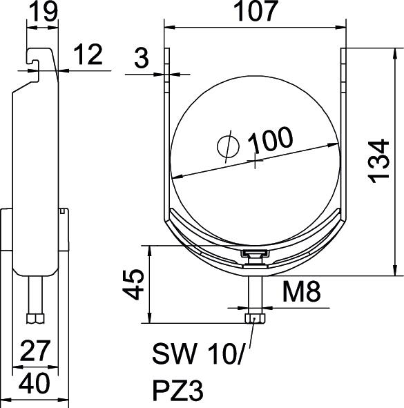 Clamping range D, max. 100 mm Clamping range D, min. 90 mm CO2 Footprint (GWP) Cradle-to-Gate 0,6475 kg CO2e / 1 Piece Dimension 90-100mm Dimension A 27 mm Dimension B 107 mm Dimension C 40 mm Dimension G (mm) M8 Dimension H 134 mm Dimension L 45 mm Dimension t 3 mm For pipe diameter, max. 100 mm For pipe diameter, min. 90 mm for rail with slot width (with interval), max. 22 mm for rail with slot width (with interval), min. 18 mm Halogen-free yes Height 134 mm Length 27 mm Length of external dimensions 40 mm Material Steel Material addition Steel Material of trough Plastic Material quality of trough Polypropylene Max. Tightening torque 5 Nm Mounting type Profile rail Number of cables/pipes 1 Plate thickness 3 mm Slot width 10 mm Surface Hot-dip galvanised Surface addition hot galvanised Thread M8 Width 107 mm With counter-trough no With plastic trough yes - All types