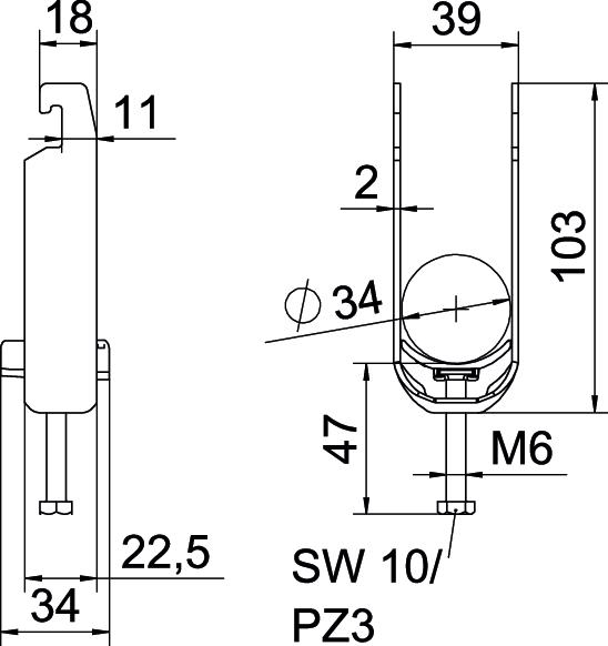 Clamping range D, max. 34 mm Clamping range D, min. 28 mm CO2 Footprint (GWP) Cradle-to-Gate 0,2066 kg CO2e / 1 Piece Dimension 28-34mm Dimension A 22,5 mm Dimension B 39 mm Dimension C 34 mm Dimension G (mm) M6 Dimension H 103 mm Dimension L 47 mm Dimension t 2 mm For pipe diameter, max. 34 mm For pipe diameter, min. 28 mm for rail with slot width (with interval), max. 22 mm for rail with slot width (with interval), min. 18 mm Halogen-free yes Height 103 mm Length 22,5 mm Length of external dimensions 34 mm Material Steel Material addition Steel Material of trough Plastic Material quality of trough Polypropylene Max. Tightening torque 3 Nm Mounting type Profile rail Number of cables/pipes 2 Plate thickness 2 mm Slot width 10 mm Surface Hot-dip galvanised Surface addition hot galvanised Thread M6 Width 39 mm With counter-trough no With plastic trough yes - All types