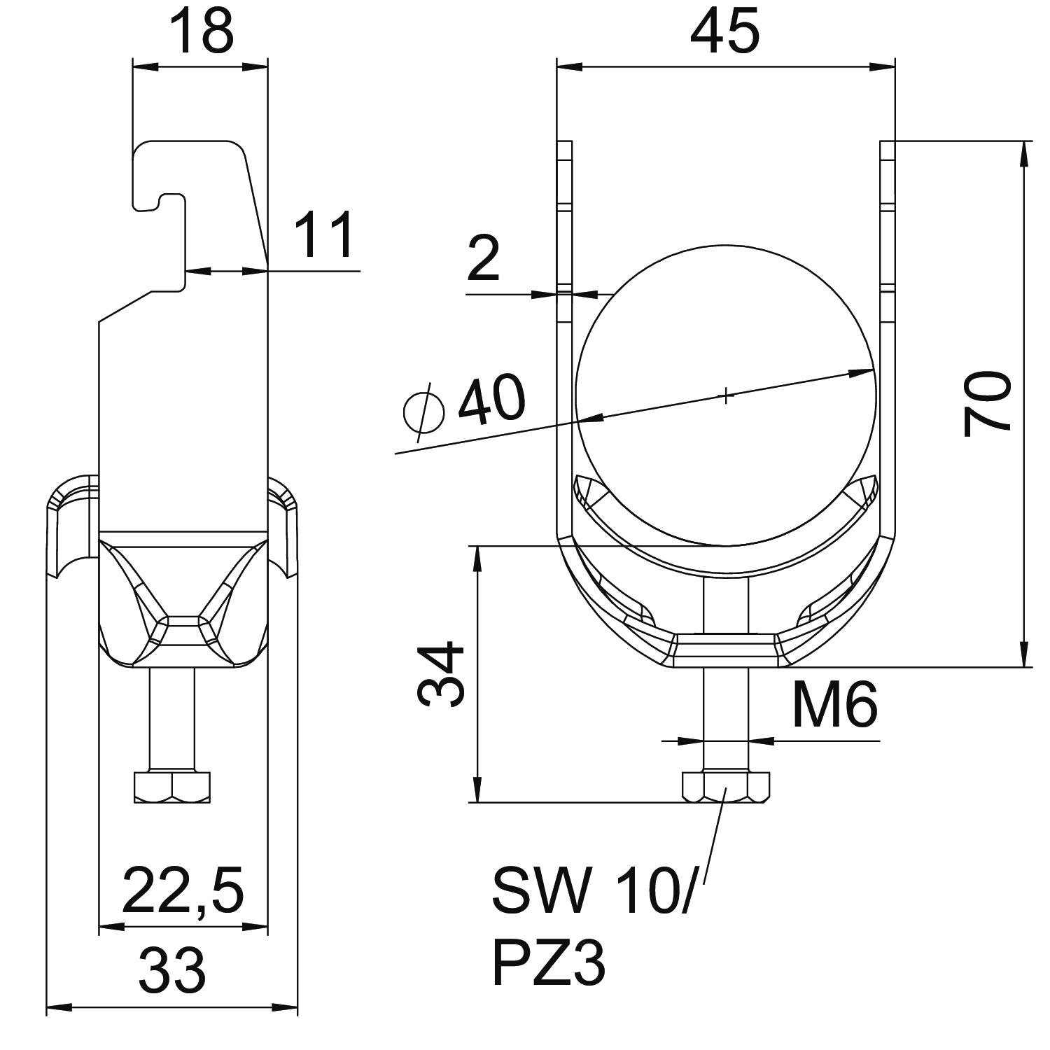 Clamping range D, max. 40 mm Clamping range D, min. 34 mm CO2 Footprint (GWP) Cradle-to-Gate 0,5146 kg CO2e / 1 Piece Dimension 34-40mm Dimension A 22,5 mm Dimension B 45 mm Dimension C 33 mm Dimension G (mm) M6 Dimension H 70 mm Dimension L 34 mm Dimension t 2 mm For pipe diameter, max. 40 mm For pipe diameter, min. 34 mm for rail with slot width (with interval), max. 22 mm for rail with slot width (with interval), min. 18 mm Halogen-free yes Height 70 mm Length 22,5 mm Length of external dimensions 33 mm Material Stainless steel 1.4301 Material addition Rustproof steel Max. Tightening torque 3 Nm Mounting type Profile rail Number of cables/pipes 1 Plate thickness 2 mm Slot width 10 mm Surface Bright, treated Surface addition Untreated Thread M6 Width 45 mm With metal trough yes - All types