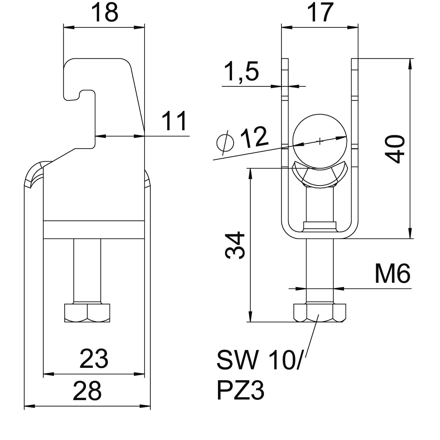 Clamping range D, max. 12 mm Clamping range D, min. 8 mm CO2 Footprint (GWP) Cradle-to-Gate 0,2153 kg CO2e / 1 Piece Dimension 8-12mm Dimension A 22,5 mm Dimension B 17 mm Dimension C 28 mm Dimension G (mm) M6 Dimension H 40 mm Dimension L 34 mm Dimension t 1,5 mm For pipe diameter, max. 12 mm For pipe diameter, min. 8 mm for rail with slot width (with interval), max. 22 mm for rail with slot width (with interval), min. 18 mm Halogen-free yes Height 40 mm Length 22,5 mm Length of external dimensions 28 mm Material Stainless steel 1.4301 Material addition Rustproof steel Max. Tightening torque 3 Nm Mounting type Profile rail Number of cables/pipes 1 Plate thickness 1,5 mm Slot width 10 mm Surface Bright, treated Surface addition Untreated Thread M6 Width 17 mm With metal trough yes - All types