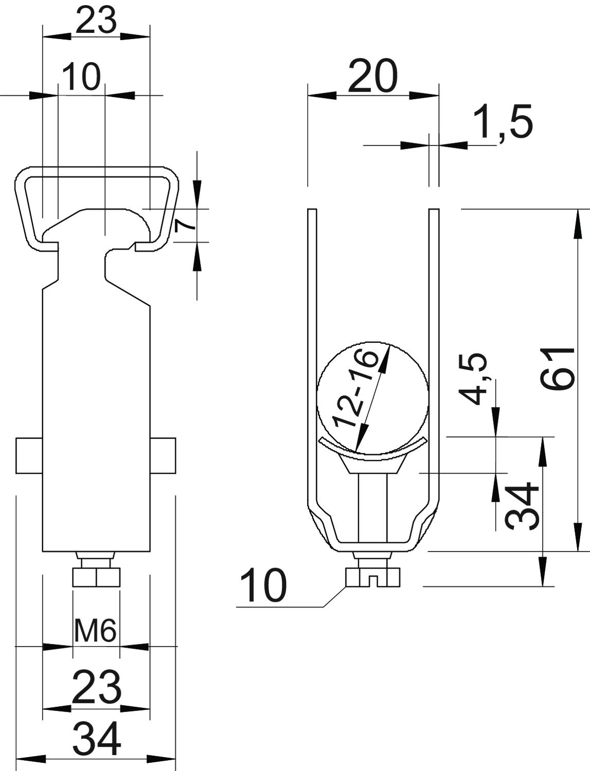 Clamping range D, max. 16 mm Clamping range D, min. 12 mm CO2 Footprint (GWP) Cradle-to-Gate 0,0976 kg CO₂e / 1 Piece Dimension 12-16mm Dimension A 23 mm Dimension B 20 mm Dimension C 34 mm Dimension G (mm) M6 Dimension H 61 mm Dimension L 34 mm Dimension t 1,5 mm Dimension x 4,5 mm for rail with slot width (with interval), max. 17 mm for rail with slot width (with interval), min. 16 mm Halogen-free yes Impact-resistant no Material Steel Material addition Steel Material of trough Plastic Material quality of trough Polypropylene Max. Tightening torque 3 Nm Mounting type Profile rail Number of cables/pipes 2 Surface Hot-dip galvanised Surface addition hot galvanised With counter-trough no With metal trough no With plastic trough yes - All types