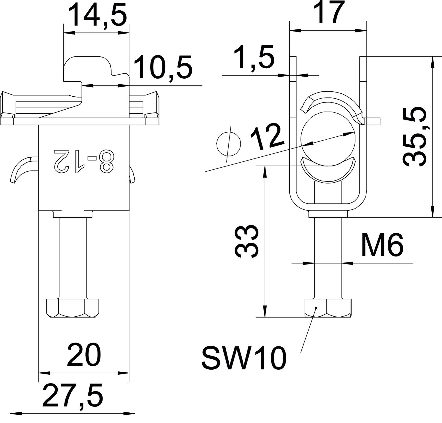 Clamping range D, max. 12 mm Clamping range D, min. 8 mm CO2 Footprint (GWP) Cradle-to-Gate 0,1991 kg CO₂e / 1 Piece Dimension 8-12mm Dimension A 20 mm Dimension B 16 mm Dimension C 34 mm Dimension G (mm) M6 Dimension H 34 mm Dimension L 34 mm Dimension t 1,5 mm for rail with slot width (with interval), max. 12 mm for rail with slot width (with interval), min. 11 mm Halogen-free yes Height 35,5 mm Impact-resistant no Length 20 mm Material Stainless steel 1.4301 Material addition Rustproof steel Material of counter-trough Rustproof steel Material of trough Rustproof steel Material quality of trough Stainless steel 304 (1.4301) Max. Tightening torque 3 Nm Mounting type Profile rail Number of cables/pipes 1 Surface Bright, treated Surface addition Untreated Width 17 mm With counter-trough yes With metal trough yes With plastic trough no - All types
