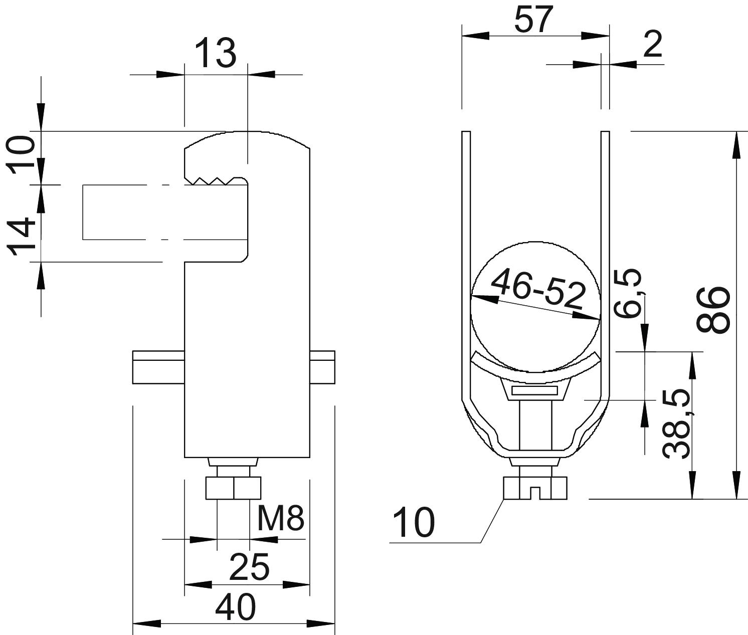 Clamping range D, max. 52 mm Clamping range D, min. 46 mm CO2 Footprint (GWP) Cradle-to-Gate 0,2256 kg CO₂e / 1 Piece Dimension 46-52mm Dimension A 25 mm Dimension B 57 mm Dimension C 40 mm Dimension E 13 mm Dimension G (mm) M8 Dimension H 86 mm Dimension L 38,5 mm Dimension t 2 mm Dimension x 6,5 mm for 1 cable H 86 mm for 1 cable L 38,5 for 2 cable H 140 mm for 2 cable L 45,5 mm For pipe diameter, max. 50 mm For pipe diameter, min. 50 mm Halogen-free yes Impact-resistant no Material Steel Material addition Steel Material of trough Plastic Material quality of trough Polypropylene Max. Tightening torque 5 Nm Mounting type Flat profile Number of cables/pipes 1 Surface Hot-dip galvanised Surface addition hot galvanised With counter-trough no With metal trough no With plastic trough yes - All types