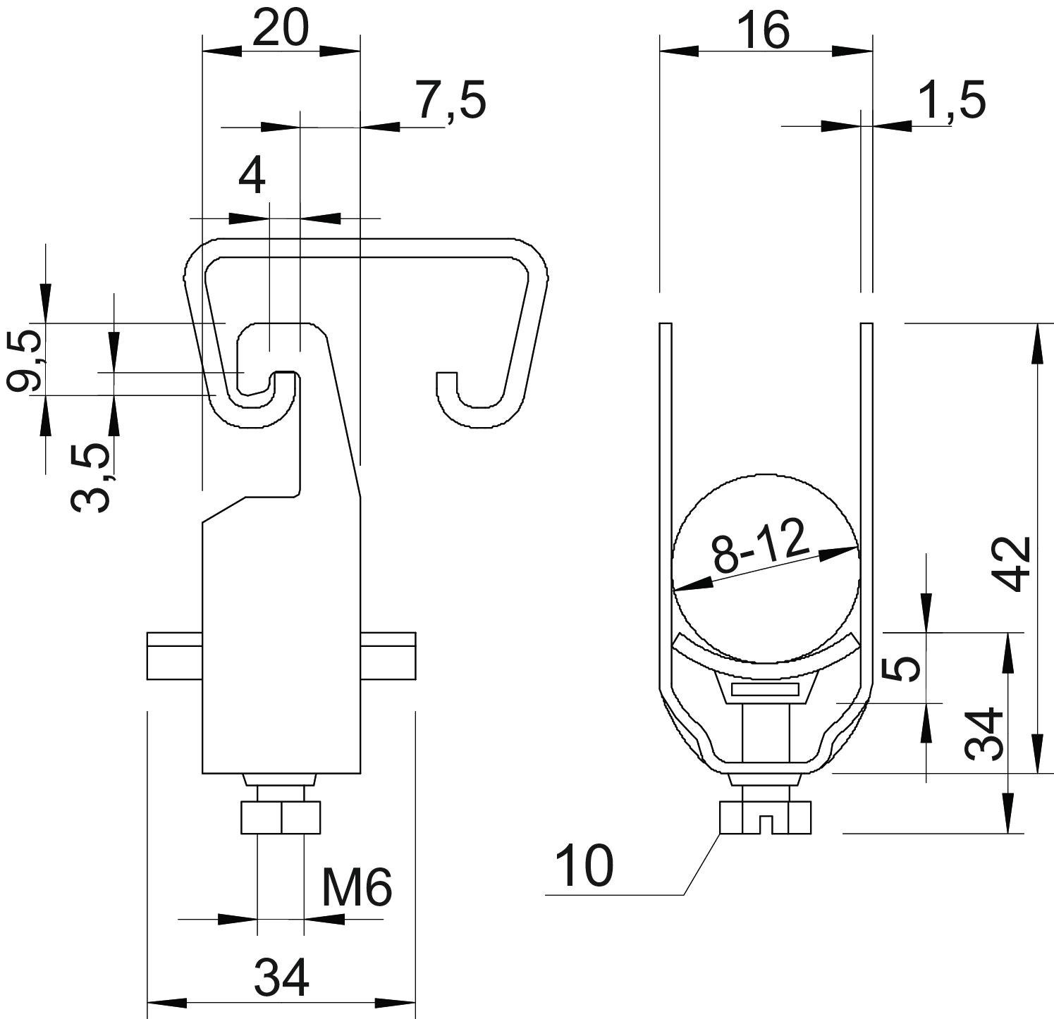 Clamping range D, max. 12 mm Clamping range D, min. 8 mm CO2 Footprint (GWP) Cradle-to-Gate 0,0598 kg CO₂e / 1 Piece Dimension 8-12mm Dimension A 20 mm Dimension B 16 mm Dimension C 34 mm Dimension G (mm) M6 Dimension H 42 mm Dimension L 34 mm Dimension t 1,5 mm Dimension x 5 mm for 1 cable H 42 mm for 1 cable L 34 for 2 cable H 56 mm for 2 cable L 34 mm for 3 cable H 70 mm for 3 cable L 47 mm for rail with slot width (with interval), max. 22 mm for rail with slot width (with interval), min. 18 mm Halogen-free yes Impact-resistant no Material Steel Material addition Steel Material of trough Plastic Material quality of trough Polypropylene Max. Tightening torque 3 Nm Mounting type Profile rail Number of cables/pipes 1 Surface Hot-dip galvanised Surface addition hot galvanised With counter-trough no With metal trough no With plastic trough yes - All types