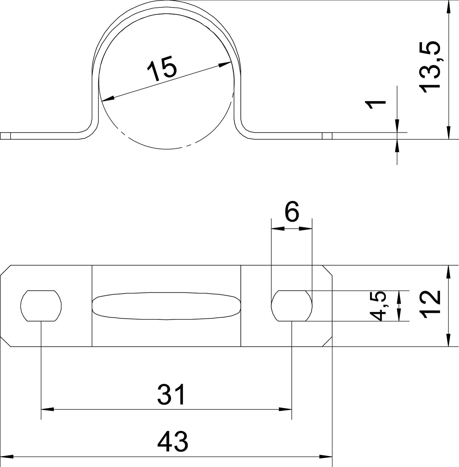 CO2 Footprint (GWP) Cradle-to-Gate 0,0123 kg CO2e / 1 Piece Dimension 15mm Dimension A 43 mm Dimension B 31 mm Dimension b 12 mm Dimension d 4,5 mm Dimension D 15 mm Dimension e 6 mm Dimension H 13,5 mm Dimension t 1 mm Distance to the wall no Fastening type Screw hole For diameter 15 Halogen-free yes Height 13,5 mm Hole size 4,5 x 6 mm Length 43 mm Material Steel Material thickness 1 mm Nominal diameter 15 mm Number of cables/pipes 1 Plastic-covered no Suitable in fire protection area no Surface Electrogalvanized UV-resistant yes Version for Two-lobe Width 12 mm - All types