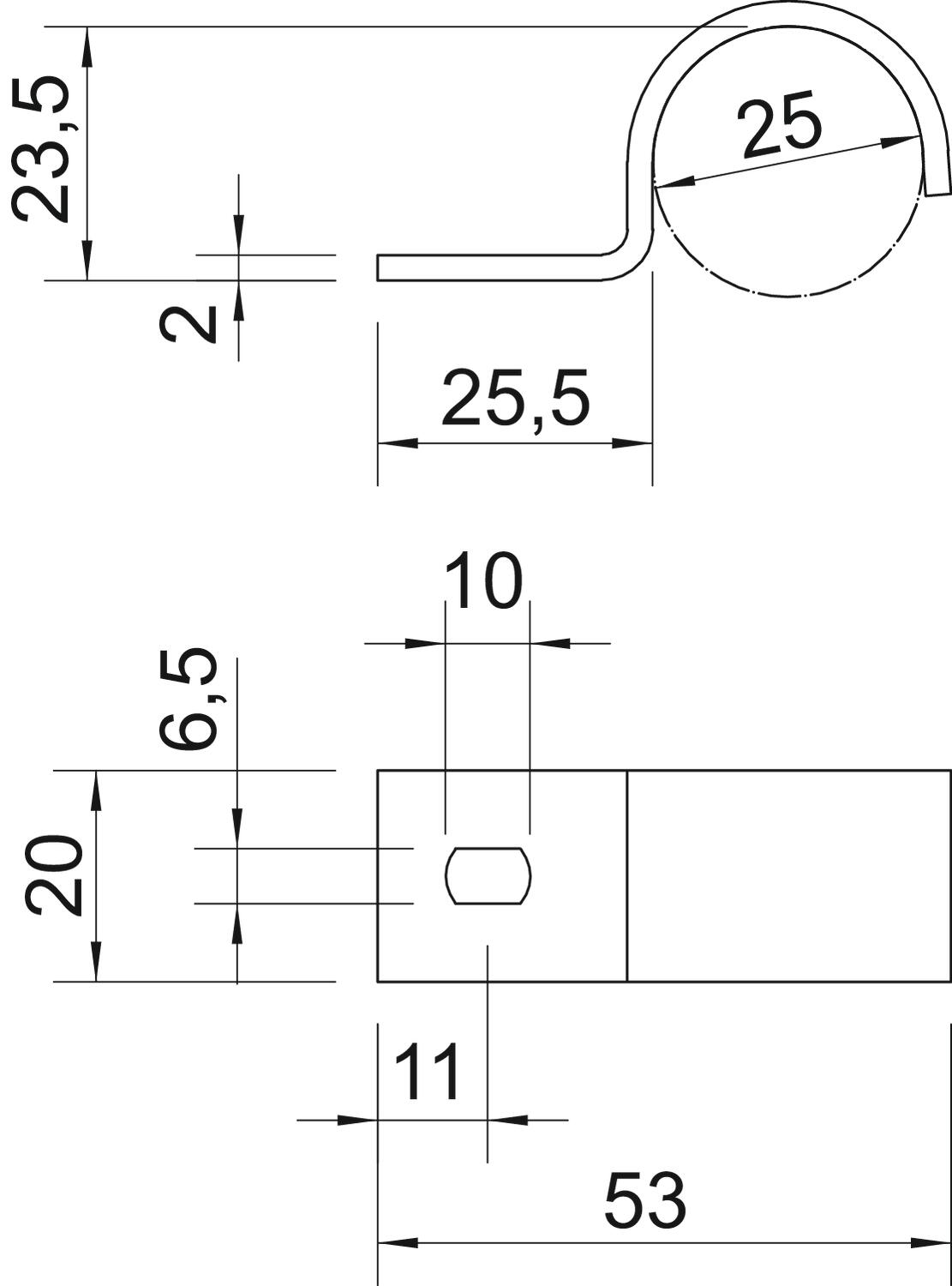 CO2 Footprint (GWP) Cradle-to-Gate 0,0735 kg CO2e / 1 Piece Dimension 25mm Dimension A 11 mm Dimension b 20 mm Dimension D 25 mm Dimension H 23,5 mm Dimension L 25,5 mm Dimension L1 53 mm Dimension t 3 mm Distance to the wall no Fastening type Screw hole For diameter 25 Halogen-free yes Height 23,5 mm Hole size 6,5 x 10 mm Length 53 mm Material Steel Material thickness 2 mm Nominal diameter 25 mm Number of cables/pipes 1 Plastic-covered no Size M25 Suitable in fire protection area no Surface Hot-dip galvanised UV-resistant yes Version for Single-lobe Width 20 mm - All types