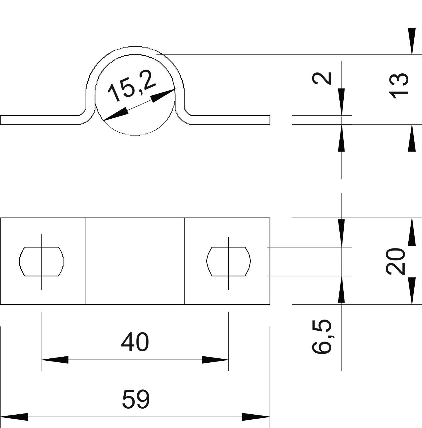 CO2 Footprint (GWP) Cradle-to-Gate 0,0525 kg CO2e / 1 Piece Dimension 16mm Dimension A 59 mm Dimension b 20 mm Dimension B 40 mm Dimension D 15,2 mm Dimension d 6,5 mm Dimension e 10 mm Dimension H 13 mm Dimension t 2 mm Distance to the wall no Fastening type Screw hole For diameter 16 Halogen-free yes Height 13 mm Hole size 6,5 x 10 mm Length 59 mm Material Steel Material thickness 2 mm Nominal diameter 16 mm Number of cables/pipes 1 Plastic-covered no Suitable in fire protection area no Surface Hot-dip galvanised UV-resistant yes Version for Two-lobe Width 20 mm - All types