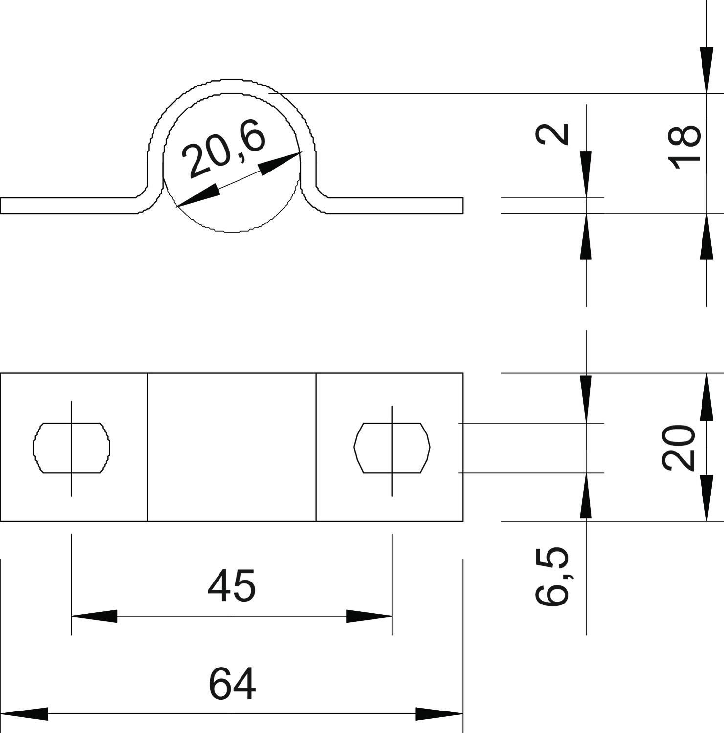 CO2 Footprint (GWP) Cradle-to-Gate 0,0624 kg CO2e / 1 Piece Dimension 20mm Dimension A 64 mm Dimension b 20 mm Dimension B 45 mm Dimension D 20,4 mm Dimension d 6,5 mm Dimension e 10 mm Dimension H 18 mm Dimension t 2 mm Distance to the wall no Fastening type Screw hole For diameter 20 Halogen-free yes Height 18 mm Hole size 6,5 x 10 mm Length 64 mm Material Steel Material thickness 2 mm Nominal diameter 20 mm Number of cables/pipes 1 Plastic-covered no Suitable in fire protection area no Surface Hot-dip galvanised UV-resistant yes Version for Two-lobe Width 20 mm - All types