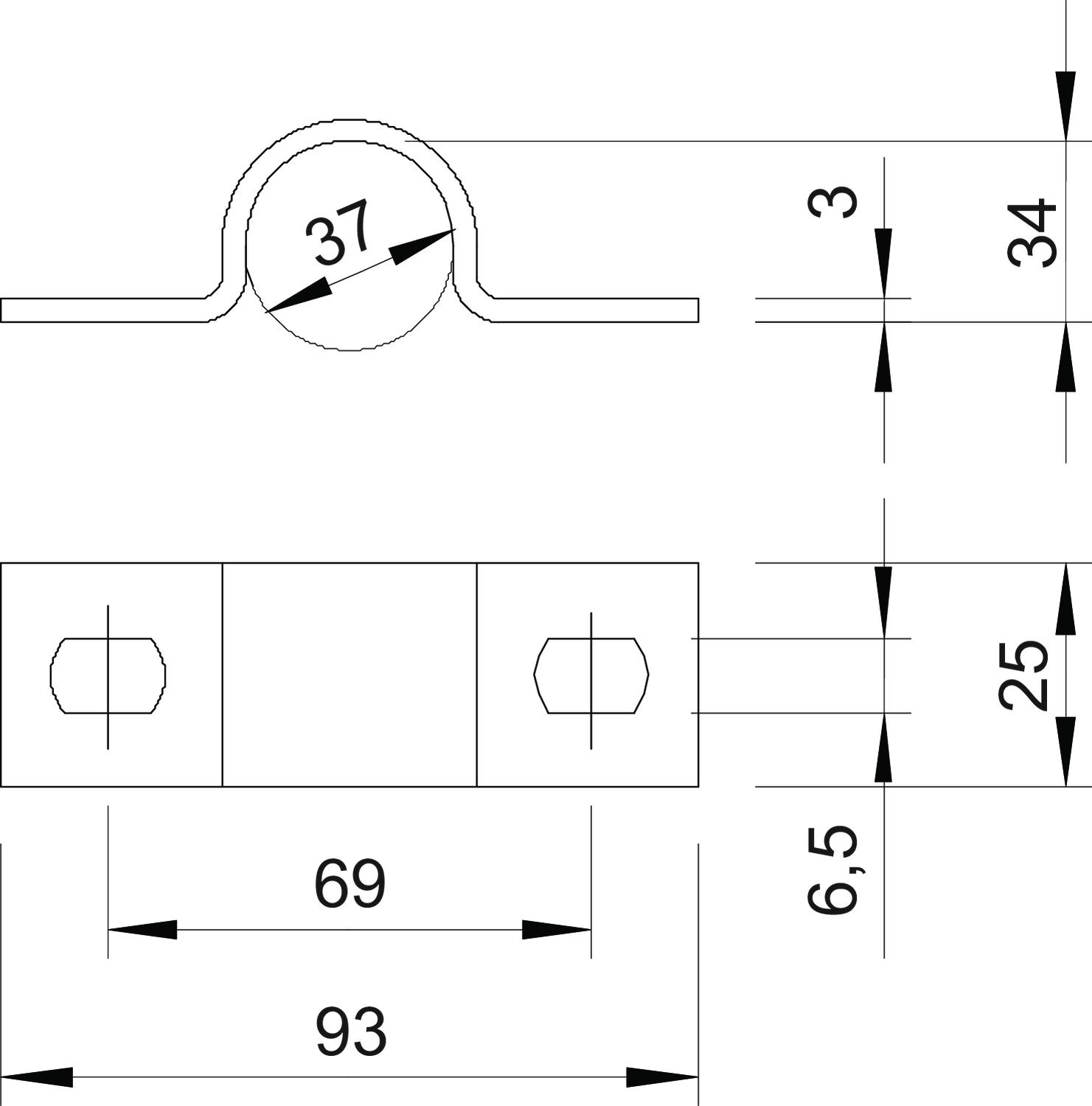 CO2 Footprint (GWP) Cradle-to-Gate 0,1837 kg CO2e / 1 Piece Dimension 37mm Dimension A 93 mm Dimension B 69 mm Dimension b 25 mm Dimension d 6,5 mm Dimension D 37 mm Dimension e 10 mm Dimension H 34 mm Dimension t 3 mm Distance to the wall no Fastening type Screw hole For diameter 37 Halogen-free yes Height 34 mm Hole size 6,5 x 10 mm Length 93 mm Material Steel Material thickness 3 mm Nominal diameter 37 mm Number of cables/pipes 1 Plastic-covered no Suitable in fire protection area no Surface Hot-dip galvanised UV-resistant yes Version for Two-lobe Width 25 mm - All types